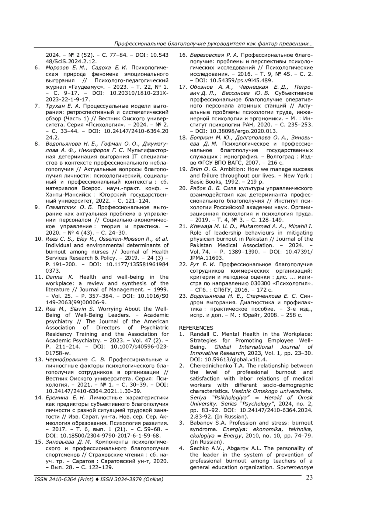 7. Трухан Е. А. Процессуальные модели выгорания: ретроспективный и систематический обзор (Часть 1) // Вестник Омского университета. Серия “Психология”. - 2024. - № 2. - С. 33-44. - 10.24147/2410-6364.20 24.2. DOI: 10.24147/2410-6364.2024.2 EDN: YBDSQL