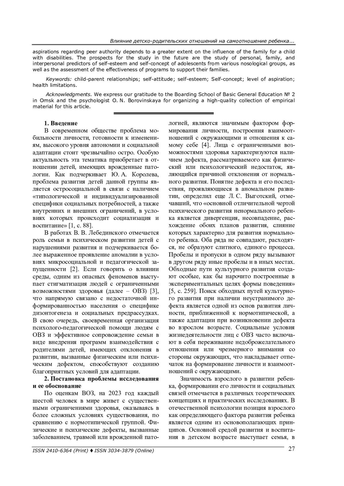 Описывается специфика самооценки и Я-концепции ребенка с ограниченными возможностями здоровья, влияние на них детско-родительских отношений. Эмпирическую базу исследования составили 80 человек (40 детей и 40 матерей). Выборка включала детей 10-12 лет, из них 20 с ограниченными возможностями здоровья (с задержкой психического развития) и 20 нормотипичных детей, а также их матерей. Методическим инструментарием стали следующие методики: изучения самооценки и уровня притязаний Т. Дембо, С. Я. Рубинштейн (модификация А. М. Прихожан), «Кто Я?» М. Куна, Т. Макпартленда (в адаптации Т. В. Румянцевой), PARI Е. С. Шефер и Р. К. Белл (в адаптации Т. В. Нещерет) для диагностики установок, описывающих отношение матерей к разным сторонам семейной жизни. Результаты исследования показывают, что дети с ограниченными возможностями здоровья имеют оптимально высокий уровень притязаний. По шкалам «здоровье», «ум, способности», «авторитет у сверстников», «характер», «умелые руки», «внешность», «уверенность в себе» выявлена адекватная самооценка, указывающая на реалистичность оценки себя и своих возможностей. В самоописаниях детей с ограниченными возможностями здоровья преобладает содержание «Социального Я». Выявлено влияние параметров детско-родительских отношений на самооценку и уровень притязаний детей с ограниченными возможностями здоровья, большее количество влияний семьи проявляется в оценке собственного здоровья и черт характера у таких детей. Уровень притязаний в отношении авторитета у сверстников в большей степени зависит от влияния семьи для ребенка с ограниченными возможностями здоровья. Перспективами дальнейшего исследования выступает изучение личностных, семейных и межличностных предикторов самоотношения и Я-концепции подростков различных нозологических групп, а также оценка эффективности программ сопровождения их семей.