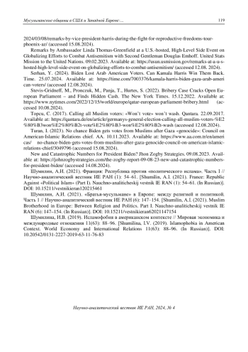 1. Ali, R. (2024). Vote left or abstain: Muslims face stark election choice in France. AA Europe. 28.06.2024. Available at: https://www.aa.com.tr/en/europe/vote-left-or-abstain-muslims-face-stark-election-choice-in-france/3261090 (accessed 11.08.2024).