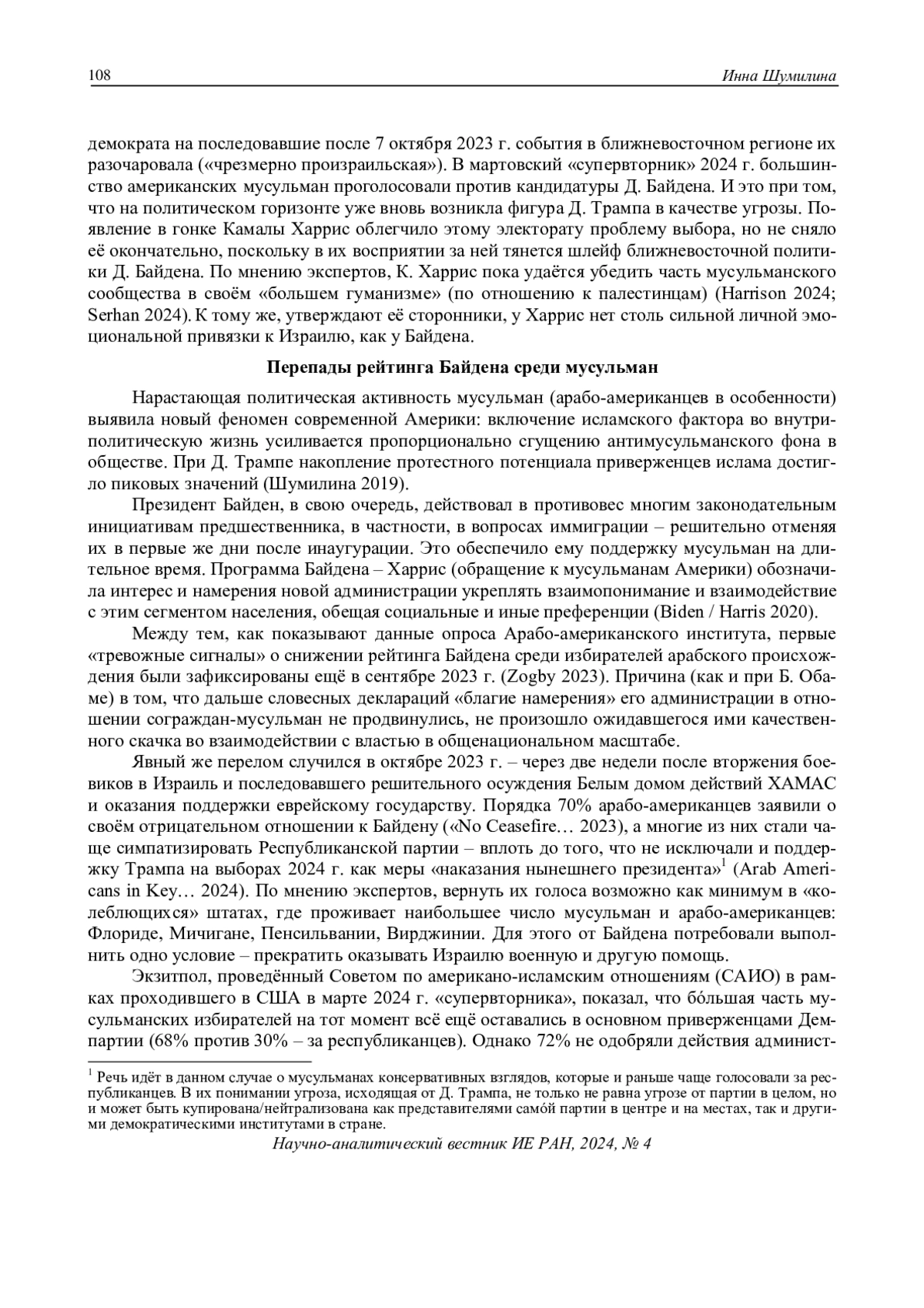 34. Serhan, Y. (2024). Biden Lost Arab American Voters. Can Kamala Harris Win Them Back. Time. 25.07.2024. Available at: https://time.com/7003376/kamala-harris-biden-gaza-arab-ameri can-voters/(accessed 12.08.2024).
