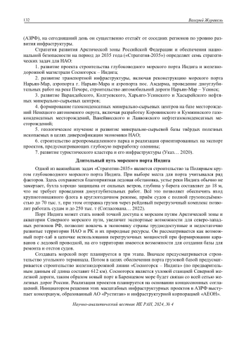 Тема статьи – первый этап реализации Ненецким автономным округом (НАО) семи задач, изложенных в Стратегии развития Арктической зоны Российской Федерации и обеспечения национальной безопасности на период до 2035 г. Особое внимание уделено проекту создания глубоководного морского порта Индига и железнодорожной магистрали Сосногорск – Индига, развитию транспортной инфраструктуры и аэропортов. Анализируется проведение дноуглубительных работ на реке Печоре, строительство автомобильной дороги, развитие нефтяных и газоконденсатных минерально-сырьевых центров на базе месторождений НАО. Оцениваются перспективы геологического изучения и развития минеральносырьевой базы твёрдых полезных ископаемых. Автор отдельно рассматривает строительство агропромышленного парка и реализацию экспортно ориентированных проектов, предусматривающих глубокую переработку оленины, вопросы развития туристического кластера региона. Делается вывод о том, что за исключением завершения строительства дороги Нарьян-Мар – Усинск, интенсивного развития туризма, остальные арктические проекты находятся на начальном этапе, их развитие тормозится недостатком или полным отсутствием финансирования.
