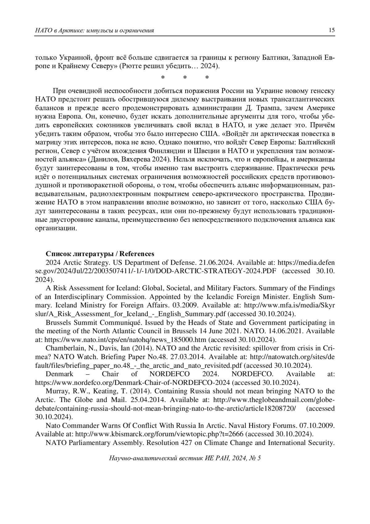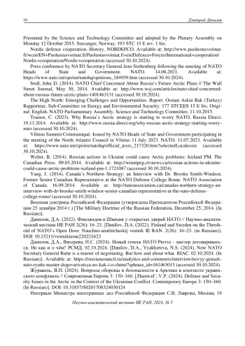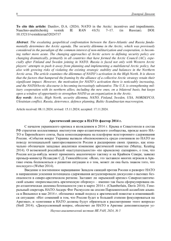 4. Chamberlain, N., Davis, Ian (2014). NATO and the Arctic revisited: spillover from crisis in Crimea? NATO Watch. Briefing Paper No.48. 27.03.2014. Available at: http://natowatch.org/sites/default/files/briefing_paper_no.48_-_the_arctic_and_nato_revisited.pdf (accessed 30.10.2024).