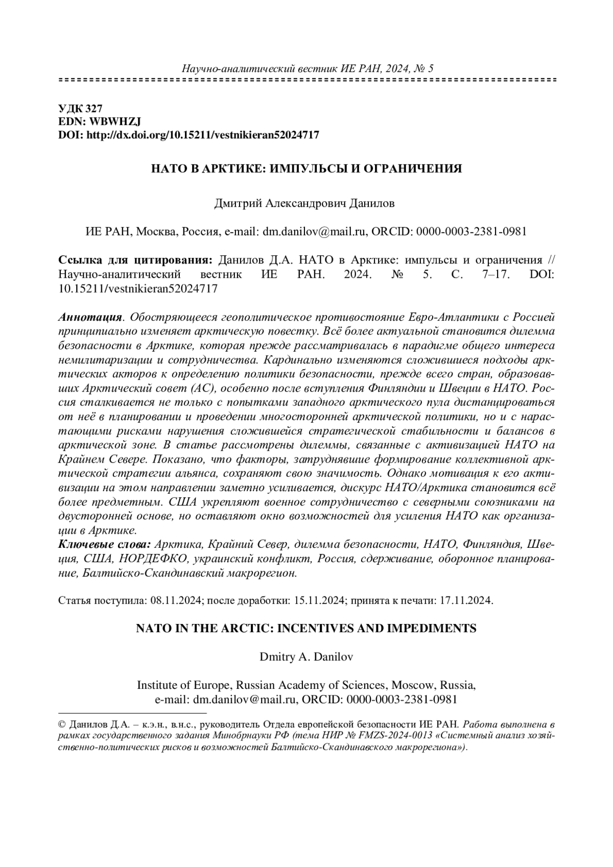 Обостряющееся геополитическое противостояние Евро-Атлантики с Россией принципиально изменяет арктическую повестку. Всё более актуальной становится дилемма безопасности в Арктике, которая прежде рассматривалась в парадигме общего интереса немилитаризации и сотрудничества. Кардинально изменяются сложившиеся подходы арктических акторов к определению политики безопасности, прежде всего стран, образовавших Арктический совет (АС), особенно после вступления Финляндии и Швеции в НАТО. Россия сталкивается не только с попытками западного арктического пула дистанцироваться от неё в планировании и проведении многосторонней арктической политики, но и с нарастающими рисками нарушения сложившейся стратегической стабильности и балансов в арктической зоне. В статье рассмотрены дилеммы, связанные с активизацией НАТО на Крайнем Севере. Показано, что факторы, затруднявшие формирование коллективной арктической стратегии альянса, сохраняют свою значимость. Однако мотивация к его активизации на этом направлении заметно усиливается, дискурс НАТО/Арктика становится всё более предметным. США укрепляют военное сотрудничество с северными союзниками на двусторонней основе, но оставляют окно возможностей для усиления НАТО как организации в Арктике