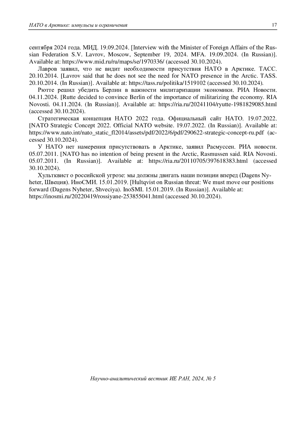 13. Trainor, C. (2023). Why Russia’s Arctic strategy is starting to worry NATO.Russia Direct. 19.11.2014. Available at: http://www.russia-direct.org/why-russias-arctic-strategy-starting-worry-nato (accessed 30.10.2024).
