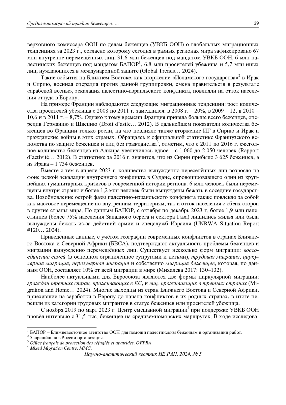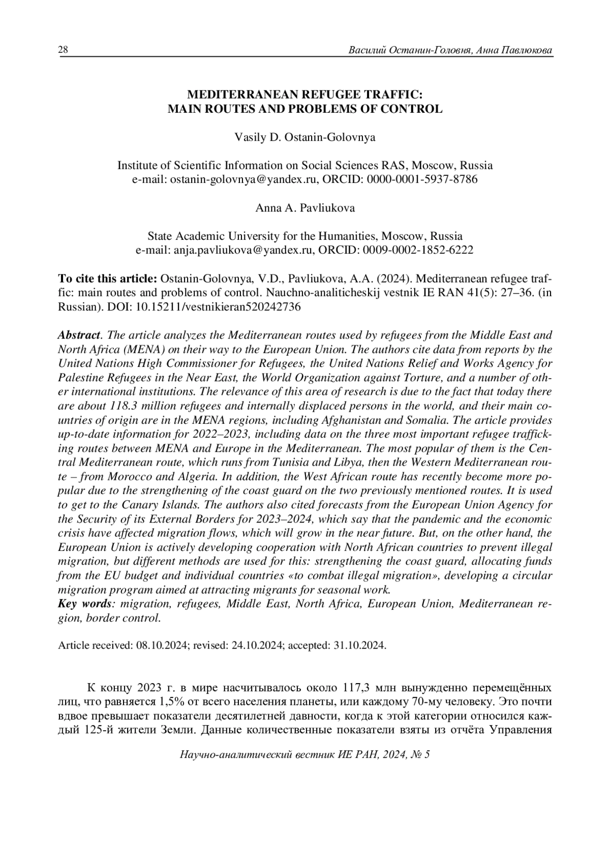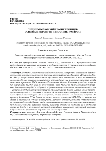 В статье рассмотрены средиземноморские маршруты в направлении Европейского союза, которыми пользуются беженцы из стран Ближнего Востока и Северной Африки (БВСА). Актуальность данной темы обусловлена тем, что сегодня в мире насчитывается около 118,3 млн беженцев и вынужденно перемещённых лиц, а основные страны их исхода относятся к регионам БВСА, включая Афганистан и Сомали. В статье приведена актуальная информация за 2022–2023 гг., включающая в себя данные по трём важнейшим маршрутам беженцев между БВСА и Европой в Средиземноморье. Наиболее востребованный из них – центральносредиземноморский маршрут, пролегающий из Туниса и Ливии, далее западносредиземноморский – из Марокко и Алжира. В последнее время набирает популярность западноафриканский маршрут. Им пользуются, чтобы попасть на Канарские острова. По прогнозу Агентства ЕС по безопасности его внешних границ от 2023–2024 гг., потоки миграции в ближайшем будущем будут расти. Евросоюз активно развивает сотрудничество со странами Северной Африки, чтобы предотвратить нелегальную миграцию, применяя разные способы: усиление береговой охраны, выделение средств из бюджета ЕС и отдельных стран на борьбу с нелегальной миграцией, разработку программы циркулярной миграции, направленной на привлечение мигрантов на сезонные работы