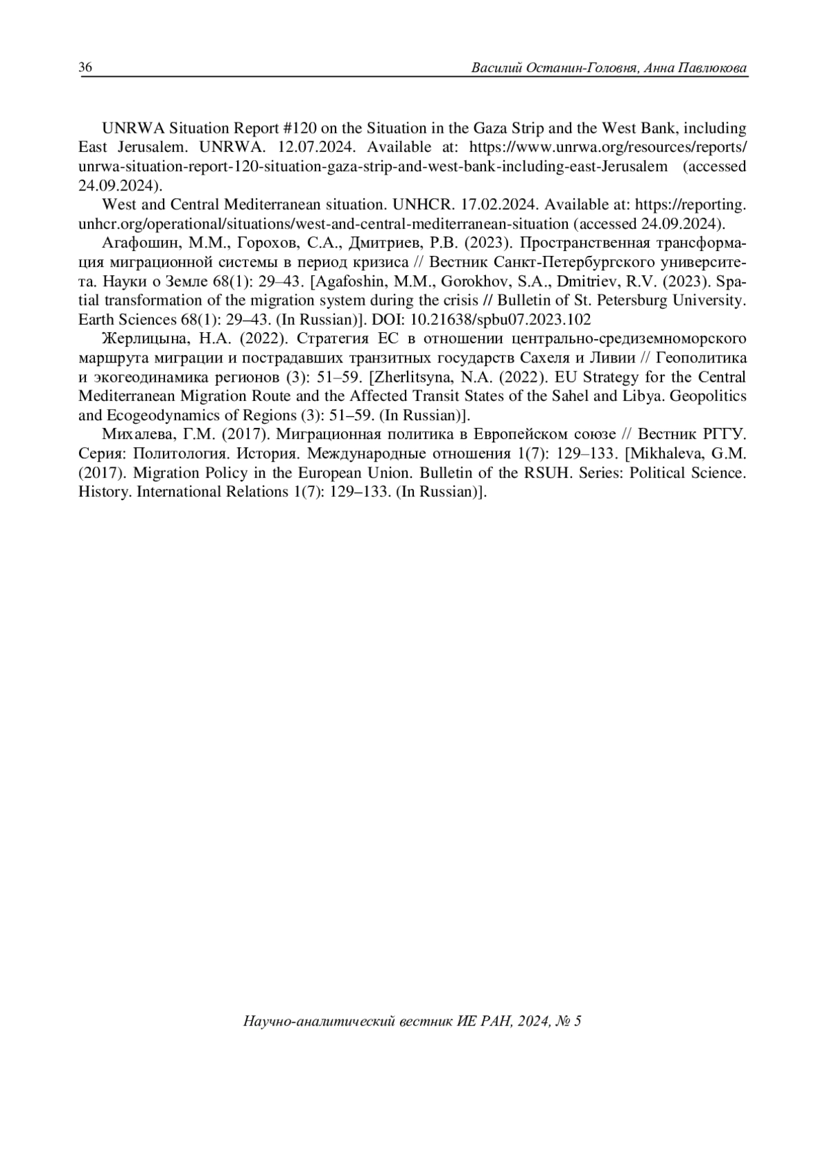 23. Жерлицына, Н.А. (2022). Стратегия ЕС в отношении центрально-средиземноморского маршрута миграции и пострадавших транзитных государств Сахеля и Ливии // Геополитика и экогеодинамика регионов (3): 51-59. EDN: OIQFHE