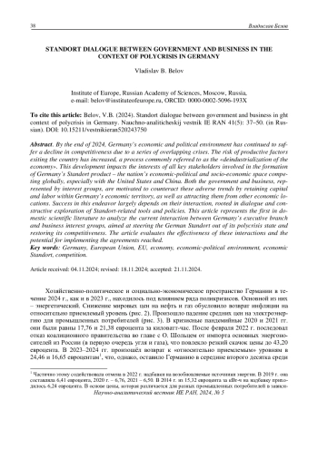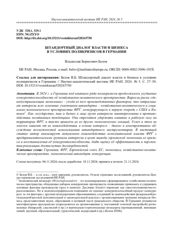 В 2024 г. в Германии под влиянием ряда поликризисов продолжалось ухудшение конкурентоспособности её хозяйственно-политического пространства. Выросли риски «деиндустриализации экономики» – ухода из него производственных факторов, что затрагивает интересы всех основных участников штандорта – хозяйственно-политического и социально-экономического пространства ФРГ, конкурирующего в первую очередь с США и Китаем1. Как государство, так и бизнес в лице групп интересов заинтересованы в противодействии негативным тенденциям. Они стремятся удержать капитал и рабочую силу на территории ФРГ, а также привлечь их из других экономических локаций. Успех в этом во многом зависит от их взаимодействия, в основе которого – диалог и конструктивное обсуждение возможностей использования штандортного инструментария. В настоящей статье автор анализирует актуальное взаимодействие исполнительной власти ФРГ с предпринимательскими группами интересов в целях вывода германской экономики из кризиса и восстановления её конкурентоспособности, даёт оценку её эффективности и перспектив реализации достигнутых договорённостей
