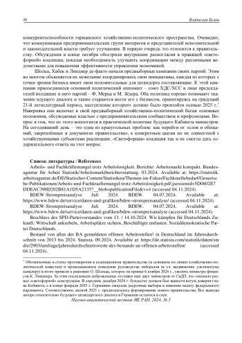 24. Белов, В.Б. (2023). Перспективы хозяйственного штандорта в условиях кризиса экономической политики “светофорной” коалиции в ФРГ // Научно-аналитический вестник ИЕ РАН 6: 63-77. EDN: VUSJSL