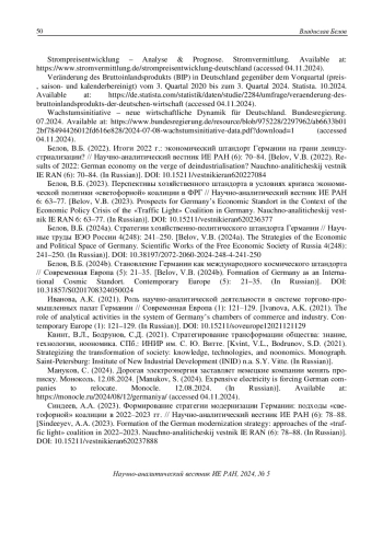 25. Белов, В.Б. (2024a). Стратегии хозяйственно-политического штандорта Германии // Научные труды ВЭО России 4(248): 241-250. EDN: BZAIDG