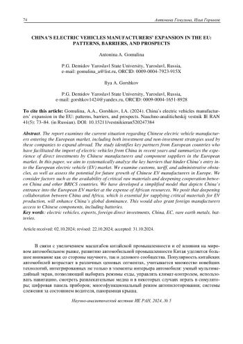 В статье описаны особенности экспортной политики китайских производителей электромобилей на европейском рынке. Выявлены инвестиционные и неинвестиционные механизмы экспансии конкретных фирм на внешние рынки. Определены ключевые партнёры Китая из стран Европейского союза по импорту электромобилей в последние годы. Обобщён опыт прямого инвестирования китайских производителей электромобилей и отдельных компонентов в страны Европы. Авторами систематизированы ключевые барьеры экспансии Китая на европейский рынок электромобилей, в том числе таможенно-тарифные и административные, а также проведена оценка перспективы дальнейшего расширения деятельности китайских производителей электромобилей в Европе с учётом факторов обеспеченности критическим сырьём и углубления сотрудничества Китая со странами БРИКС. Авторы составили упрощенную модель экспансии Китая на рынок электромобилей ЕС за счёт ресурсной базы Африки; сделали вывод о том, что углубление партнёрства между Китаем и африканскими государствами, которые играют ключевую роль в поставке критически важных материалов для создания электромобилей, будет способствовать увеличению влияния Китая на мировом рынке и обеспечению зарубежных производственных площадок китайскими комплектующими, включая аккумуляторы