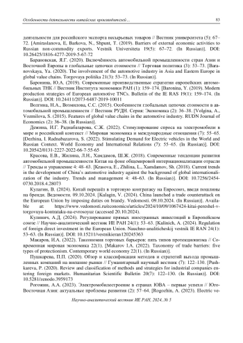 22. Красова, Е.В., Жилина, Л.Н., Хамдамов, Ш.Ж. (2018). Современные тенденции развития автомобильной промышленности Китая на фоне общемировой интернационализации отрасли // Тренды и управление 4: 48-63. EDN: YUKAUH