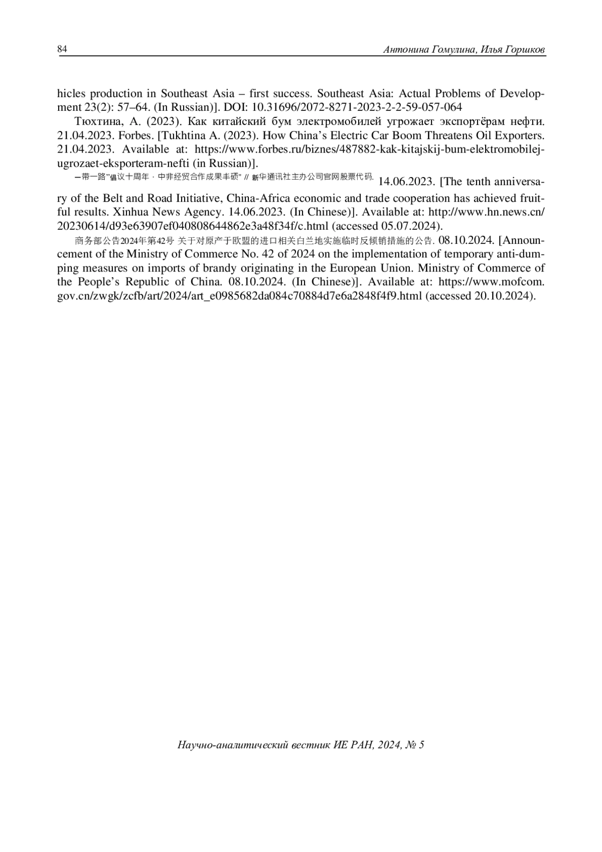 Tukhtina A. (2023). How China’s Electric Car Boom Threatens Oil Exporters. 21.04.2023. Available at: https://www.forbes.ru/biznes/487882-kak-kitajskij-bum-elektromobilej-ugrozaet-eksporteram-nefti (in Russian).