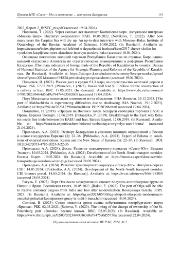 27. Международный транспортный коридор “Север - Юг”: инвестиционные решения и мягкая инфраструктура. Доклады и рабочие документы 2202. ЕАБР. 2022. [The North-South International Transport Corridor: Investment solutions and soft infrastructure. Reports and working papers 2202. EDB. 2022. (In Russian)]. Available at: https://eabr.org/upload/iblock/a2b/EDB_2022_Report-2_INSTC_rus.pdf (accessed 19.04.2024).