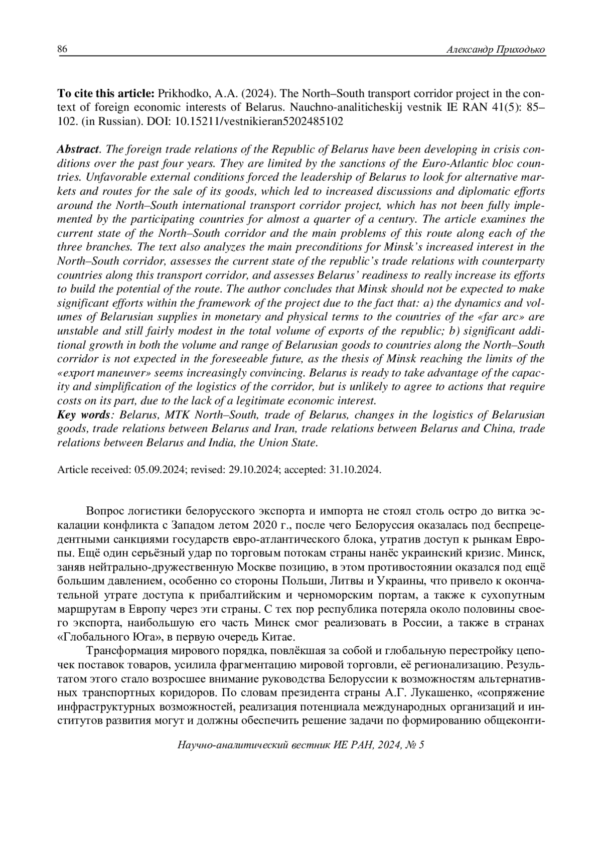 25. Лукашенко: коридор “Север-Юг” станет прорывом в области транспорта и логистики. Sputnik Азербайджан. 26.12.2023. [Lukashenko: The North-South corridor will be a breakthrough in the field of transportation and logistics. Sputnik Azerbaijan. 26.12.2023. (In Russian)]. Available at: https://az.sputniknews.ru/20231226/lukashenko-koridor-sever-yug-stanet-proryvom-v-oblasti-transporta-i-logistiki-461575183.html (accessed 21.04.2024).