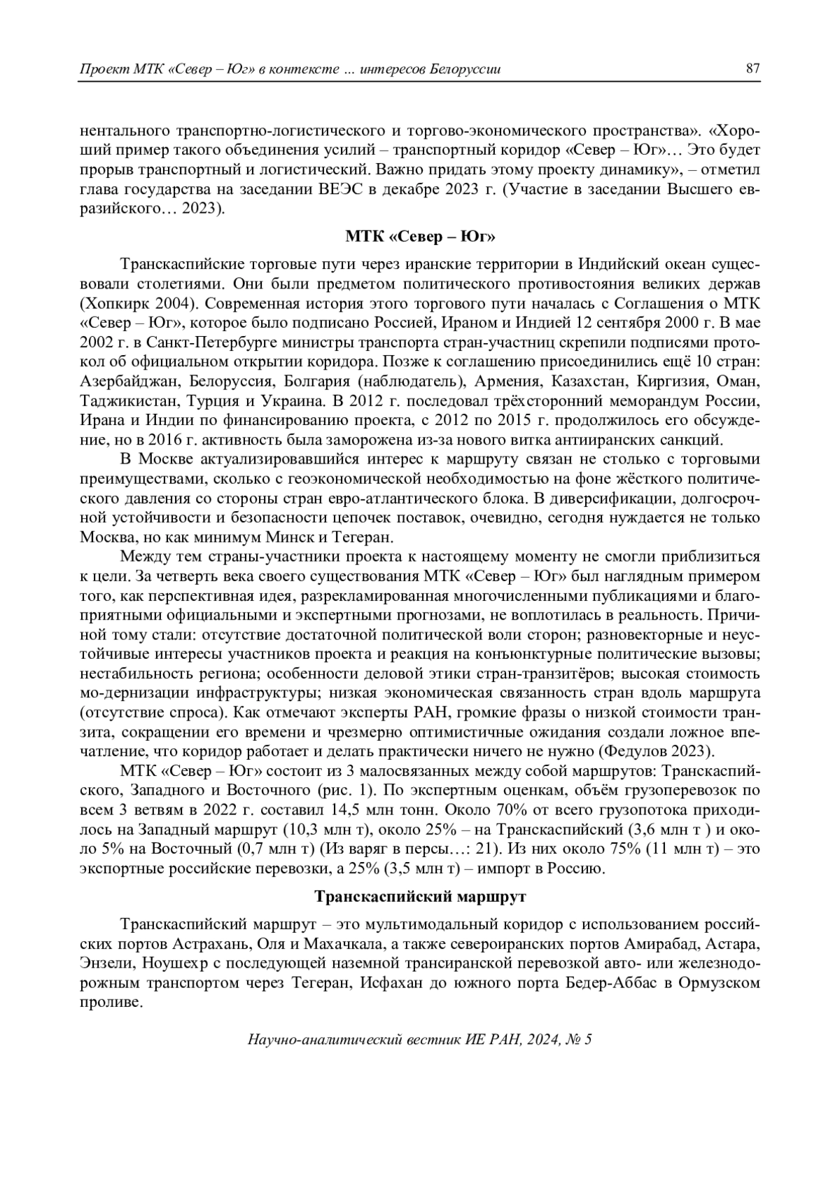 43. Федулов, И.В. (2023). Международный транспортный коридор “Север-Юг” в новых геополитических условиях: современное состояние и перспективы. Восточная аналитика (3): 81-97. [Fedulov, I.V. (2023).International transport corridor “North-South” in new geopolitical conditions: current state and prospects. Oriental analytics (3): 81-97. (In Russian)]. DOI: 10.31696/2227-5568-2023-03-081-097 EDN: YQIZFQ