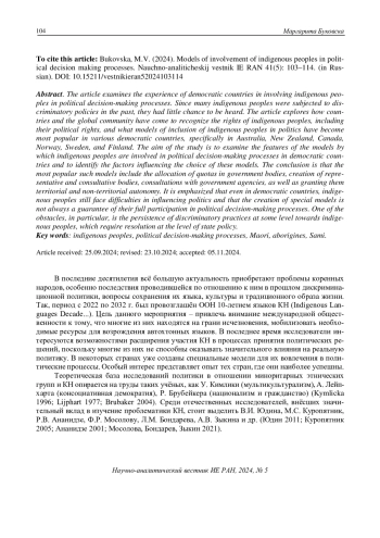 В статье рассматривается опыт демократических стран по вовлечению коренных народов (КН) в процессы принятия политических решений, раскрывается, как страны и мировое сообщество в целом пришли к признанию их прав. Анализируются различные подходы по включению КН в политику в Австралии, Новой Зеландии, Канаде, Норвегии, Швеции и Финляндии и факторы, влияющие на выбор данных подходов. Цель исследования – изучить особенности моделей, с помощью которых в демократических странах КН вовлекаются в процессы принятия политических решений, и выявить факторы, определяющие их применение. Делается вывод о том, что наибольшее распространение получило выделение квот в органах власти, создание представительных и консультативных органов, проведение консультаций с государственными ведомствами, а также предоставление коренным народам территориальной и других видов автономии. Подчёркивается, что во многих странах КН всё ещё испытывают трудности в оказании влияния на политику, а специальные модели вовлечения не всегда гарантируют их полноценное участие в процессах принятия решений