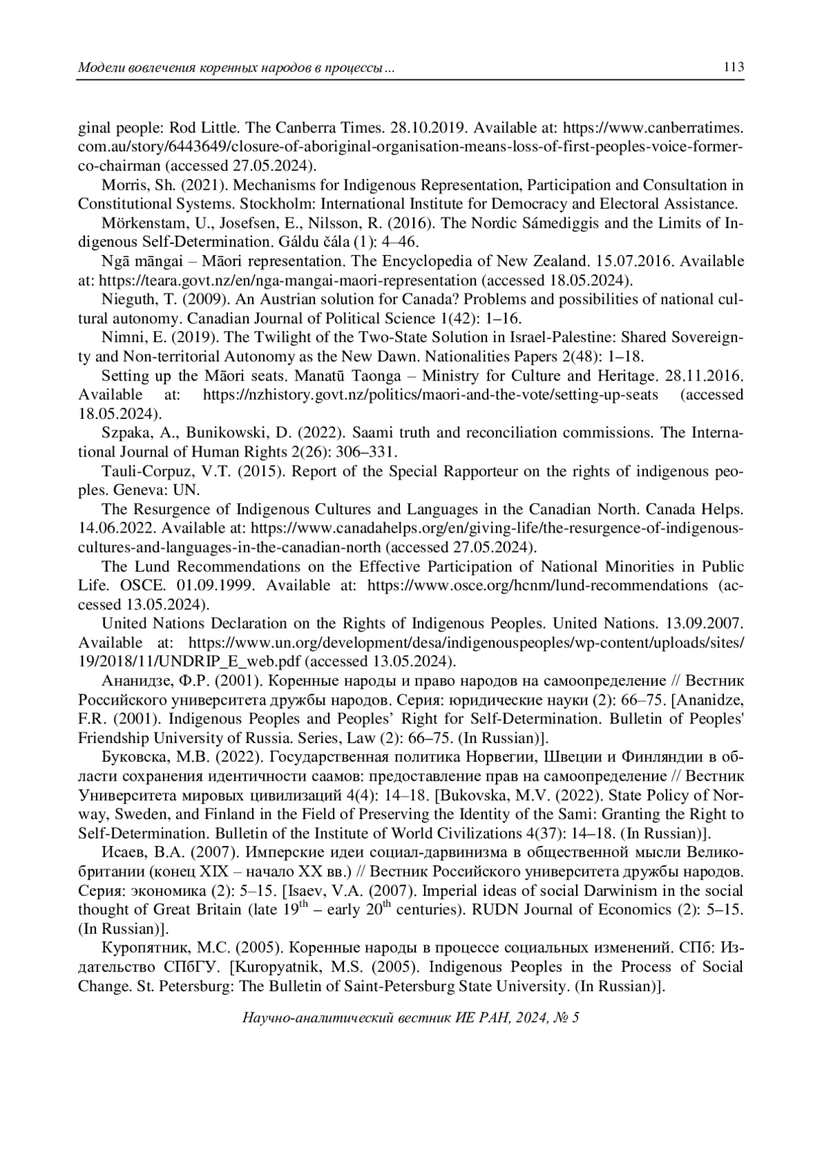 39. Мосолова, Л.М., Бондарев, А.В., Зыкин, А.В. (2021). Концептуализация понятия “коренные народы”: историография, интерпретации // Вестник гуманитарного образования 4(24): 50-59. EDN: MUWUIW