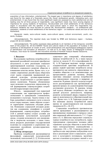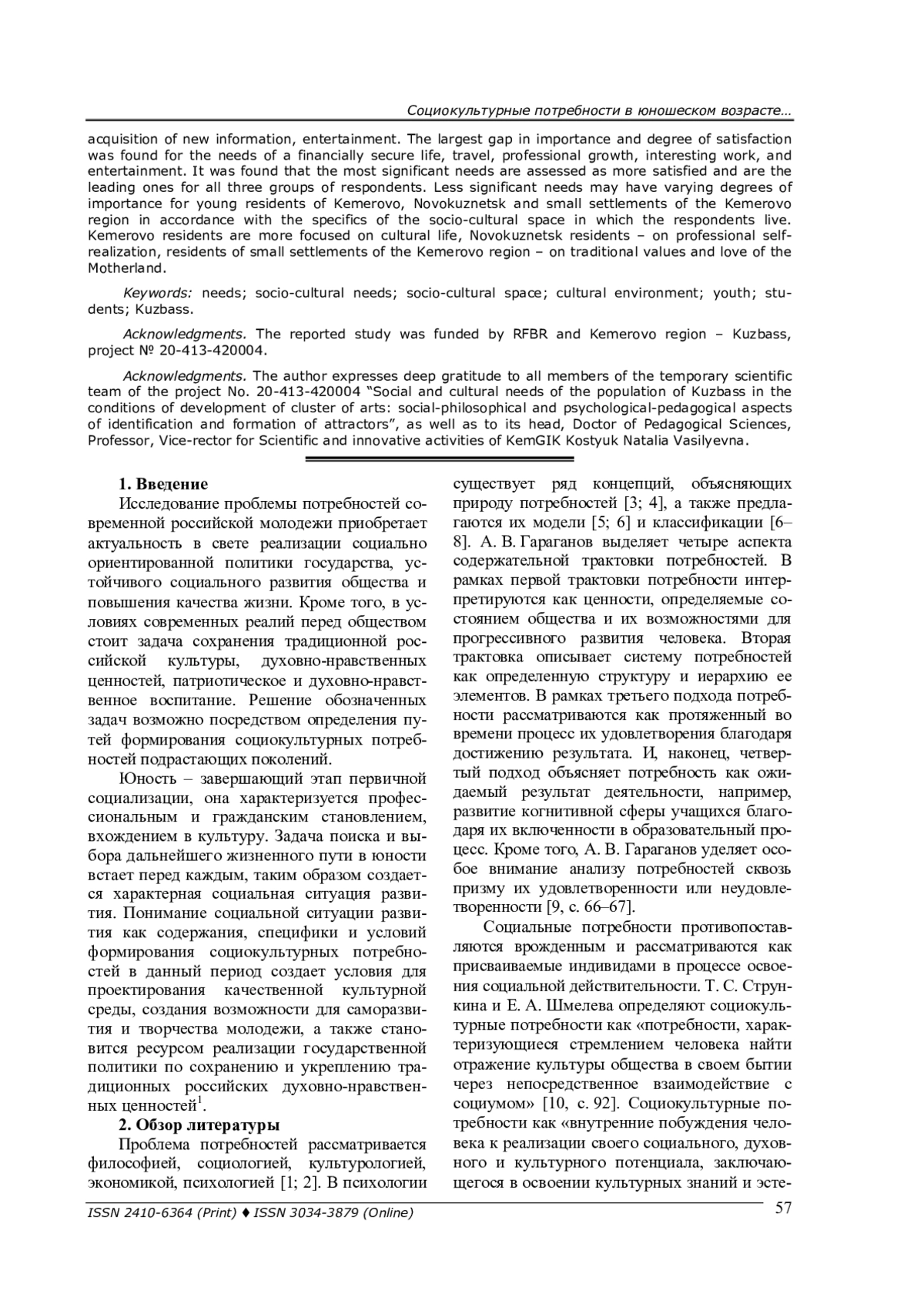 Исследование проблемы потребностей современной российской молодежи приобретает актуальность в свете реализации социально ориентированной политики государства, устойчивого социального развития общества и повышения качества жизни. Кроме того, в условиях современных реалий перед обществом стоит задача сохранения традиционной российской культуры, духовно-нравственных ценностей, патриотическое и духовно-нравственное воспитание. Решение обозначенных задач возможно посредством определения путей формирования социокультурных потребностей подрастающих поколений.