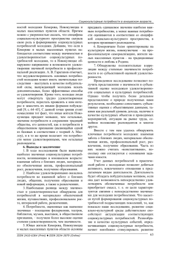 Исследование посвящено изучению социокультурных потребностей лиц юношеского возраста, проживающих в малых и больших городах Кемеровской области - Кузбасса. Социально-психологический опрос проводился онлайн, в нем приняли участие 6 198 человек в возрасте от 16 до 23 лет. Изучались субъективные оценки значимости и степени удовлетворенности 28 социальных и культурных потребностей. Отдельно проанализированы ответы жителей Кемерова и Новокузнецка - крупнейших городов области, а также ответы жителей малых городов и поселков Кемеровской области. Лидируют по значимости среди социокультурных потребности во взаимной заботе о близких людях, в материально обеспеченной жизни, профессиональном росте, развлечениях, получении образования. Данные потребности могут рассматриваться либо как базовые психологические, либо как «возрастные константы». Наиболее удовлетворенные потребности: во взаимной заботе о близких людях, общении, получении образования и новой информации, развлечениях. Наибольший разрыв в значимости и степени удовлетворенности обнаружен для потребностей в материально обеспеченной жизни, путешествиях, профессиональном росте, интересной работе, развлечениях. Обнаружено, что наиболее значимые потребности оцениваются как более удовлетворенные и являются ведущими для всех трех групп респондентов. Менее значимые потребности могут иметь разную степень важности для юных жителей Кемерова, Новокузнецка и малых населенных пунктов Кемеровской области в соответствии со спецификой социально-культурного пространства, в котором проживают респонденты. Кемеровчане более ориентированы на культурную жизнь, новокузнечане - на профессиональную самореализацию, жители малых населенных пунктов Кемеровской области - на традиционные ценности и любовь к Родине.