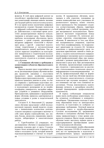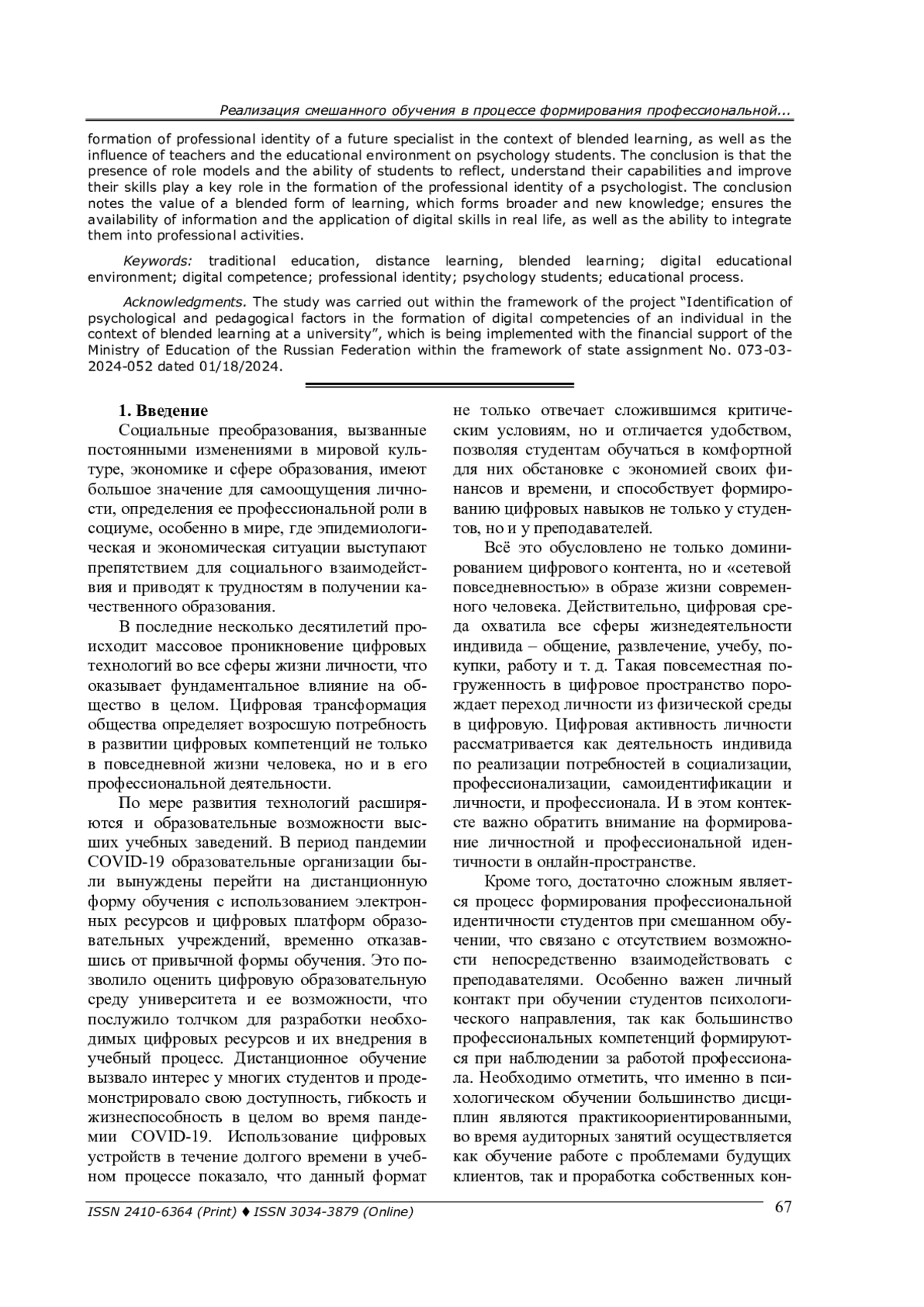 Цифровизация представляет собой информационно-технологическую революцию, сдвиг парадигмы, который влияет на всю жизнь личности. Для образовательных организаций цифровизация меняет условия обучения и взаимодействия между студентами и профессорско-преподавательским составом. Сталкивается с трудностями в связи с трансформацией образовательной системы и психологическое образование. В статье рассматриваются образовательные возможности высших учебных заведений в современном мире, описываются такие формы обучения, как традиционные, дистанционные и смешанные. Ответом на быстрое развитие образовательных технологий является смешанное обучение, которое представляет собой растущую тенденцию в современном высшем образовании. Поиск гибких возможностей обучения и формирования необходимых знаний, умений и навыков привел к активному внедрению цифровых технологий в учебный процесс. Для студентов психологического направления формирование профессиональной идентичности является неотъемлемой частью обучения в высшей школе и обусловлено рядом факторов. В данном теоретическом обзоре рассматриваются факторы, влияющие на формирование профессиональной идентичности будущего специалиста в условиях смешанного обучения, а также влияние преподавателей и образовательной среды на студентов-психологов. Делается вывод о том, что наличие образцов для подражания и способность студентов к рефлексии, понимание своих возможностей и усовершенствование навыков играют ключевую роль в формировании профессиональной идентичности психолога. Отмечается ценность смешанной формы обучения, которая обеспечивает доступность информации и применения в реальной жизни цифровых навыков, а также умение встраивать их в профессиональную деятельность.