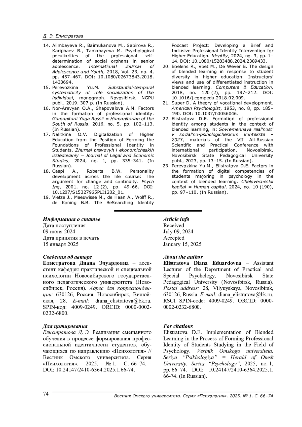 22. Елистратова Д. Э. Формирование профессиональной идентичности у студентов в условиях смешанного обучения // Современная реальность в социально-психологическом контексте - 2023: материалы VII Всероссийской научно-практической конференции с международным участием. - Новосибирск: Изд-во Новосиб. гос. пед. ун-та, 2023. - С. 13-15. EDN: NEKABK
