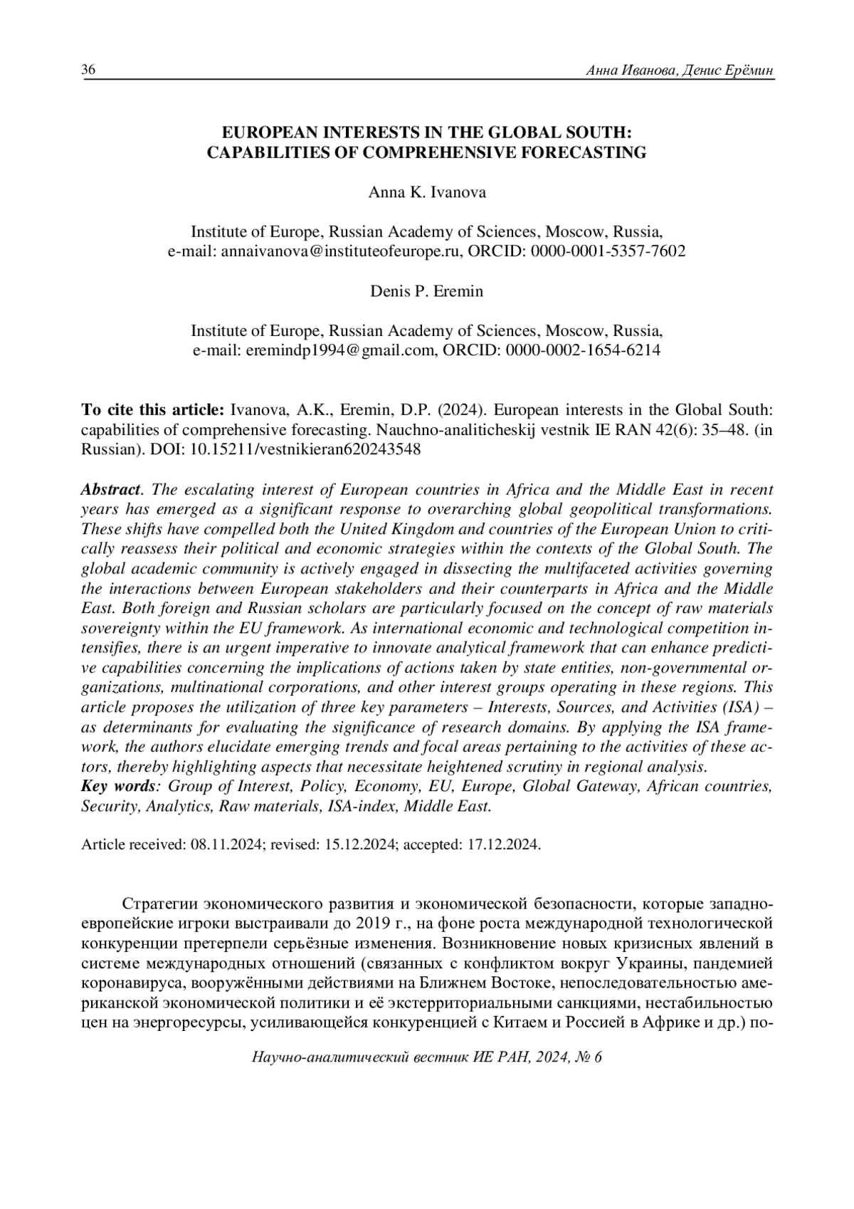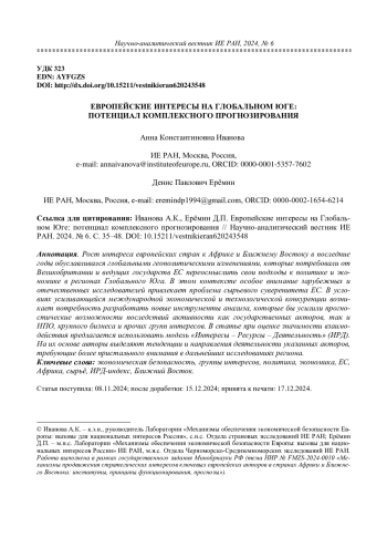 Рост интереса европейских стран к Африке и Ближнему Востоку в последние годы обуславливался глобальными геополитическими изменениями, которые потребовали от Великобритании и ведущих государств ЕС переосмыслить свои подходы к политике и экономике в регионах Глобального Юга. В этом контексте особое внимание зарубежных и отечественных исследователей привлекает проблема сырьевого суверенитета ЕС. В условиях усиливающейся международной экономической и технологической конкуренции возникает потребность разработать новые инструменты анализа, которые бы усилили прогностические возможности последствий активности как государственных акторов, так и НПО, крупного бизнеса и прочих групп интересов. В статье при оценке значимости взаимодействия предлагается использовать модель «Интересы – Ресурсы – Деятельность» (ИРД). На их основе авторы выделяют тенденции и направления деятельности указанных акторов, требующие более пристального внимания в дальнейших исследованиях региона