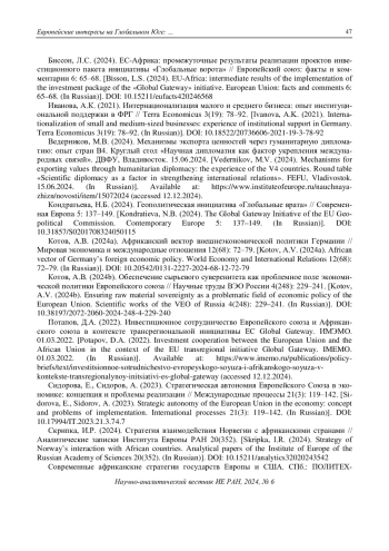25. Биссон, Л.С. (2024). ЕС-Африка: промежуточные результаты реализации проектов инвестиционного пакета инициативы “Глобальные ворота” // Европейский союз: факты и комментарии 6: 65-68.