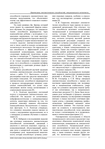 10. Гаврилова Е. В. Лингвистические способности и их когнитивные детерминанты: современные перспективы исследований // Современная зарубежная психология. - 2015. - Т. 4, № 4. - С. 30-38. -. DOI: 10.17759/jmfp.2015040405 EDN: VRBBTZ