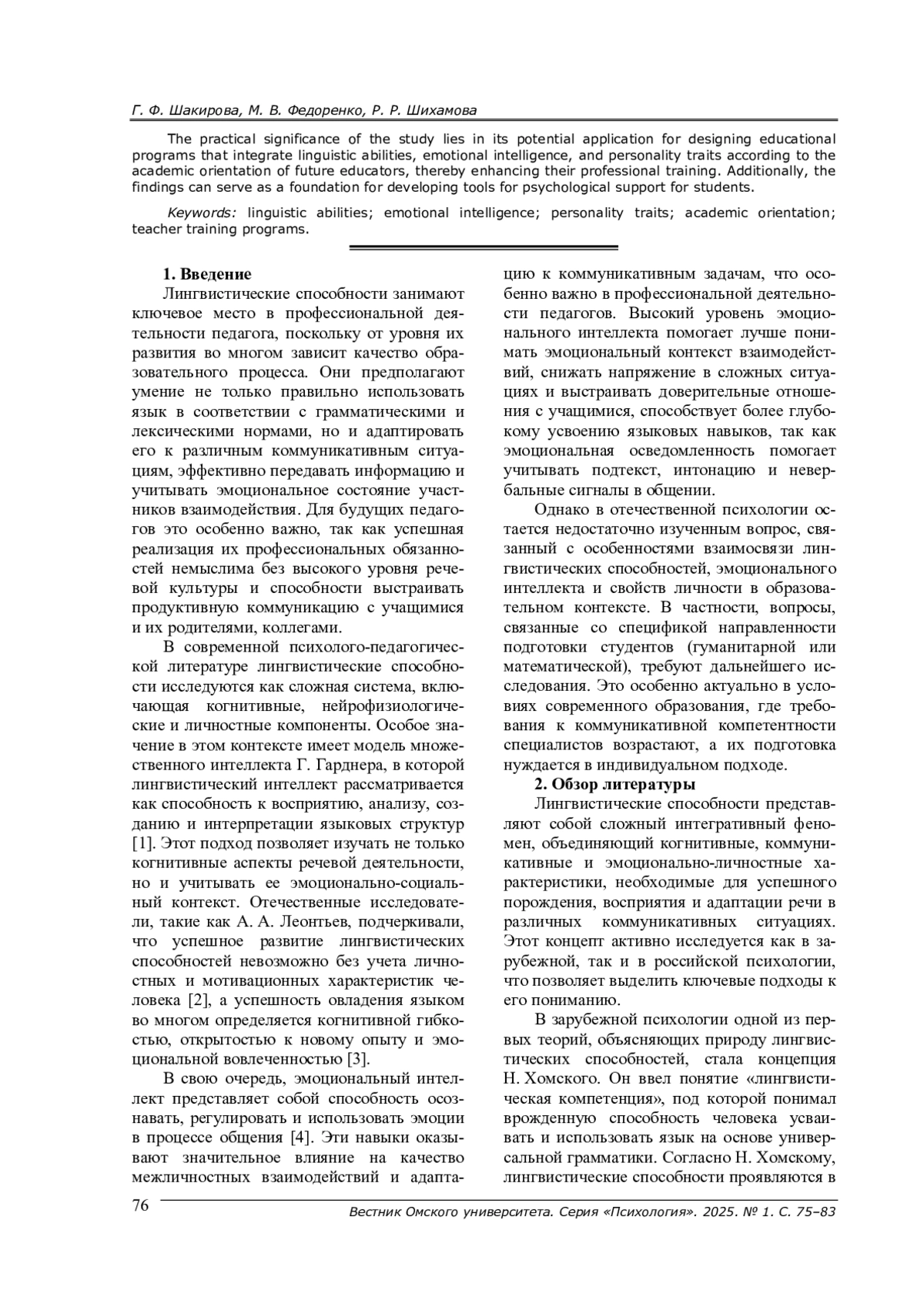 Современное образование предъявляет высокие требования к будущим педагогам, для которых важны не только знания и навыки, но и способность тонко понимать эмоции, эффективно общаться и адаптироваться к различным ситуациям в условиях быстро меняющегося мира. Данное исследование посвящено анализу особенностей взаимосвязей лингвистических способностей, эмоционального интеллекта и свойств личности у студентов педагогических специальностей различной академической направленности. Использовались три ключевые методики: тест множественного интеллекта Г. Гарднера для оценки лингвистического интеллекта, опросник ЭмИн Д. В. Люсина для измерения эмоционального интеллекта, а также личностный опросник Г. Айзенка (EPI) для анализа индивидуальных черт характера. Результаты показали значимые различия между группами респондентов: студенты гуманитарного направления имеют высокие показатели лингвистических способностей и выраженный эмоциональный интеллект, в то время как студенты математического направления демонстрируют развитые логико-математические способности. Полученные результаты отражают специфику образовательной направленности респондентов: для студентов гуманитарного направления ключевым является умение устанавливать глубокие эмоциональные связи и выстраивать социальное взаимодействие, студенты математического направления акцентируют внимание на структурировании информации и навыках межличностного общения. Результаты исследования могут быть использованы для создания образовательных программ, которые интегрируют особенности лингвистических способностей, эмоционального интеллекта и свойств личности в зависимости от академической направленности будущих педагогов. Это позволит улучшить их профессиональную подготовку. Дополнительно результаты могут служить основой для разработки инструментов психологической поддержки студентов.