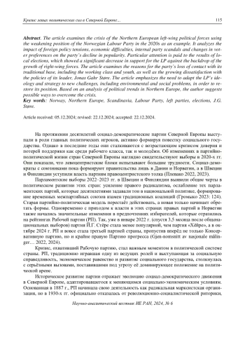 На протяжении десятилетий социал-демократические партии Северной Европы выступали в роли главных политических игроков, активно формируя повестку социального государства. Однако в последние годы они сталкиваются с возрастающим кризисом доверия и потерей поддержки как среди рабочего класса, так и молодёжи. Об изменениях в партийнополитической жизни стран Северной Европы наглядно свидетельствуют выборы в 2020-х гг. Они показали, что левоцентристские блоки испытывают большие трудности. Социал-демократы с союзниками пока формируют правительства лишь в Дании и Норвегии, а в Швеции и Финляндии уступили власть партиям правоцентристского толка (Плевако 2022, 2023)