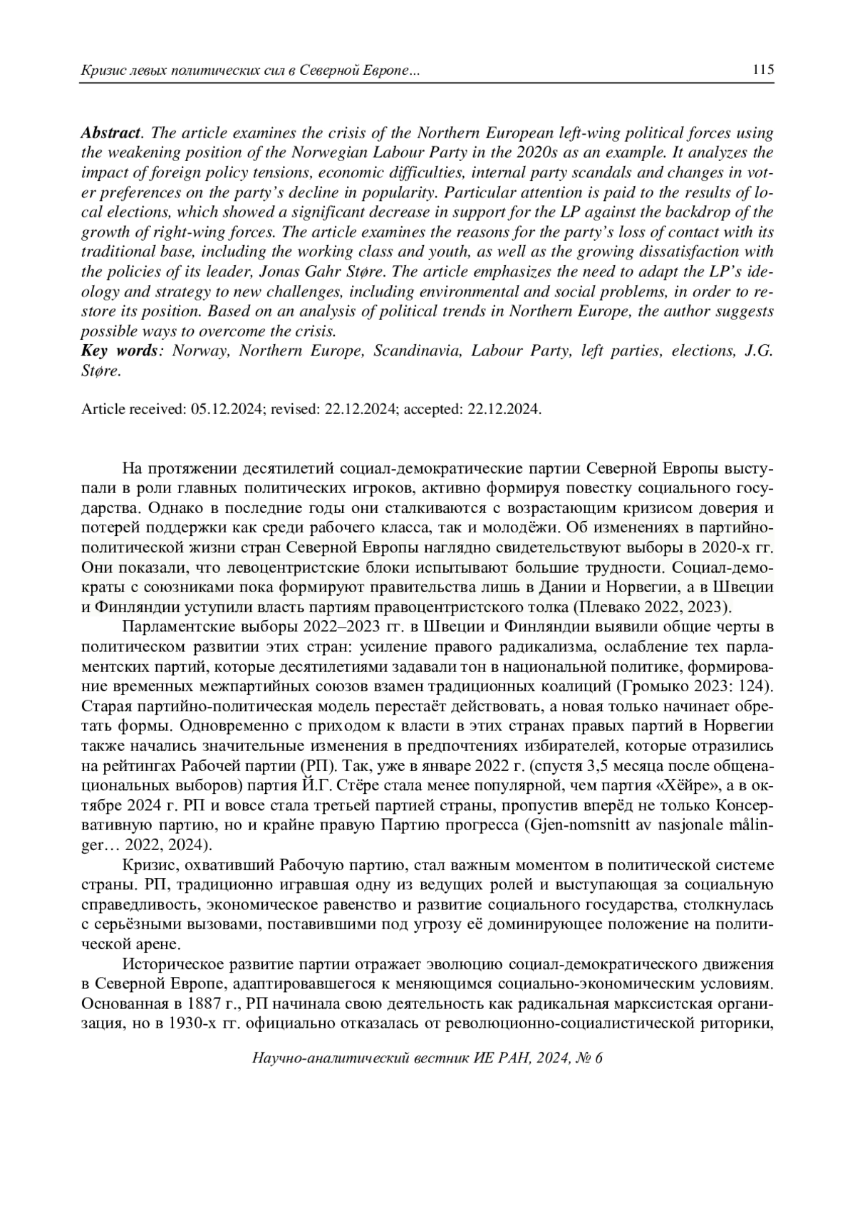 Статья посвящена кризису левых политических сил Северной Европы на примере Рабочей партии (РП) Норвегии в 2020-х гг. Анализируется влияние внешнеполитической напряжённости, экономических трудностей, внутрипартийных скандалов и изменений в предпочтениях избирателей на падение популярности партии. Особое внимание уделено результатам местных выборов, показавших значительное снижение поддержки РП на фоне роста правых сил. Рассмотрены причины потери связи партии с традиционной базой, включая рабочий класс и молодёжь, а также усиливающееся недовольство политикой её лидера Йонаса Гара Стёре. Сделан вывод, что РП для восстановления её позиций необходима адаптация идеологии и стратегии к новым вызовам, включая экологические и социальные проблемы