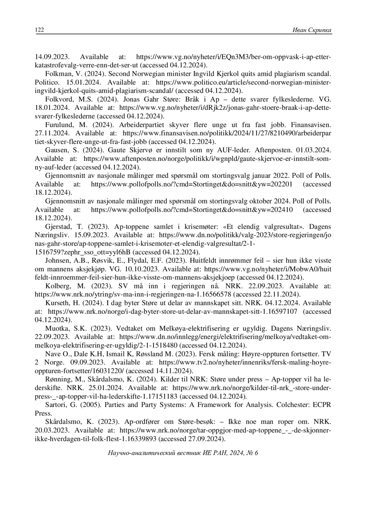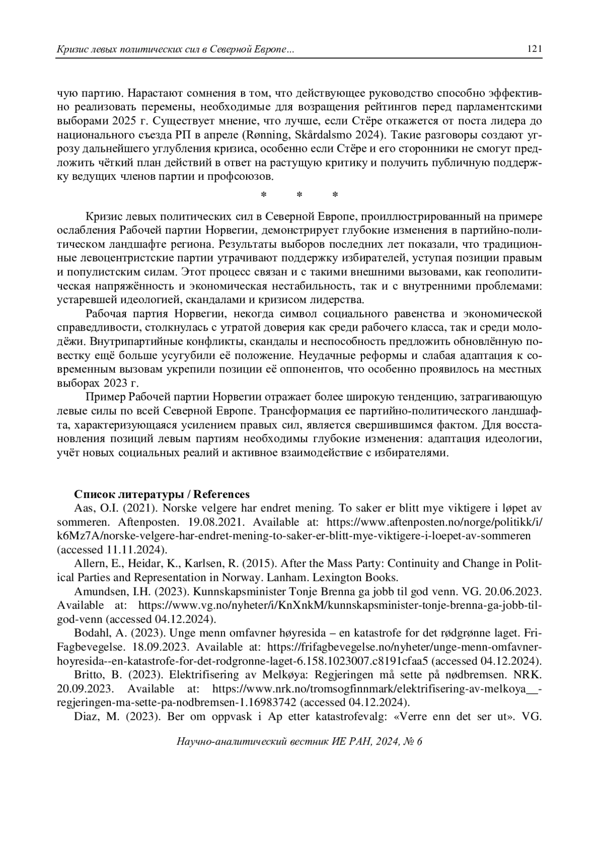 6. Diaz, M. (2023). Ber om oppvask i Ap etter katastrofevalg: “Verre enn det ser ut”. VG. 14.09.2023. Available at: https://www.vg.no/nyheter/i/EQn3M3/ber-om-oppvask-i-ap-etter-katastrofevalg-verre-enn-det-ser-ut (accessed 04.12.2024).