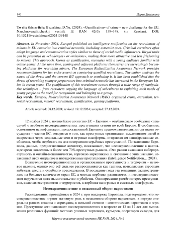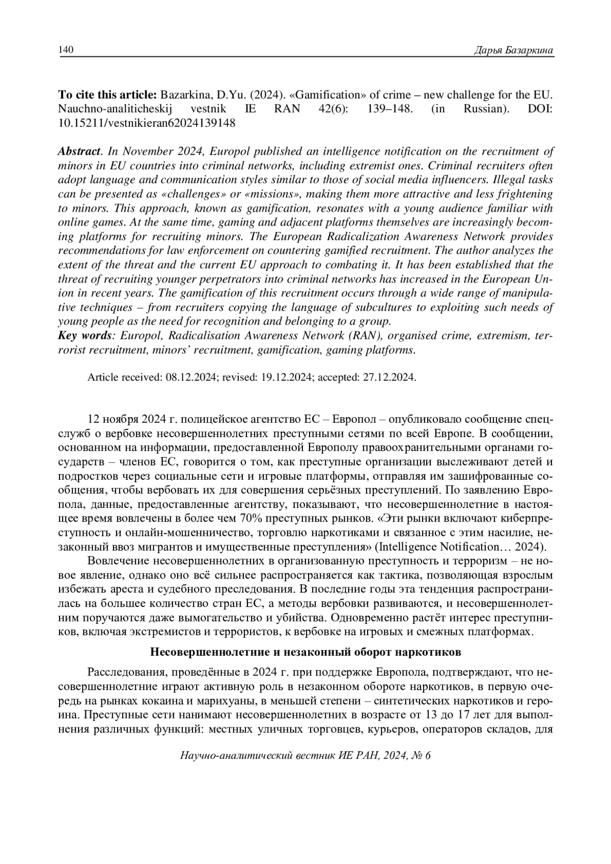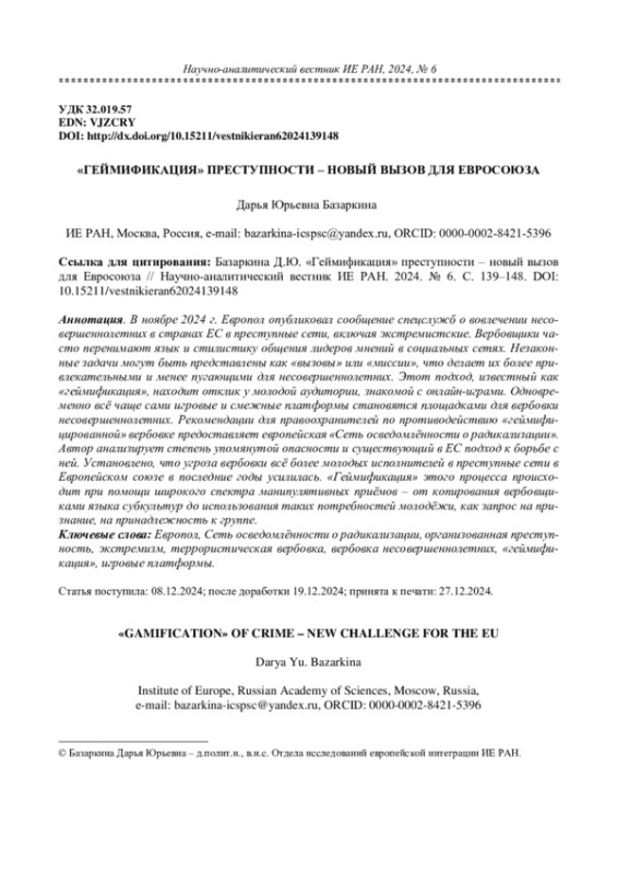 В ноябре 2024 г. Европол опубликовал сообщение спецслужб о вовлечении несовершеннолетних в странах ЕС в преступные сети, включая экстремистские. Вербовщики часто перенимают язык и стилистику общения лидеров мнений в социальных сетях. Незаконные задачи могут быть представлены как «вызовы» или «миссии», что делает их более привлекательными и менее пугающими для несовершеннолетних. Этот подход, известный как «геймификация», находит отклик у молодой аудитории, знакомой с онлайн-играми. Одновременно всё чаще сами игровые и смежные платформы становятся площадками для вербовки несовершеннолетних. Рекомендации для правоохранителей по противодействию «геймифицированной» вербовке предоставляет европейская «Сеть осведомлённости о радикализации». Автор анализирует степень упомянутой опасности и существующий в ЕС подход к борьбе с ней. Установлено, что угроза вербовки всё более молодых исполнителей в преступные сети в Европейском союзе в последние годы усилилась. «Геймификация» этого процесса происходит при помощи широкого спектра манипулятивных приёмов – от копирования вербовщиками языка субкультур до использования таких потребностей молодёжи, как запрос на признание, на принадлежность к группе