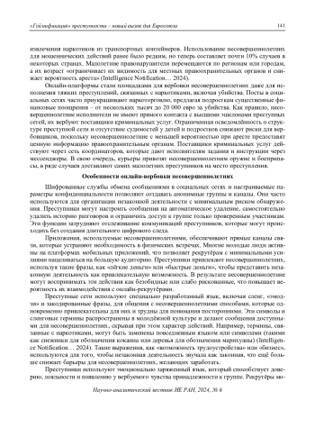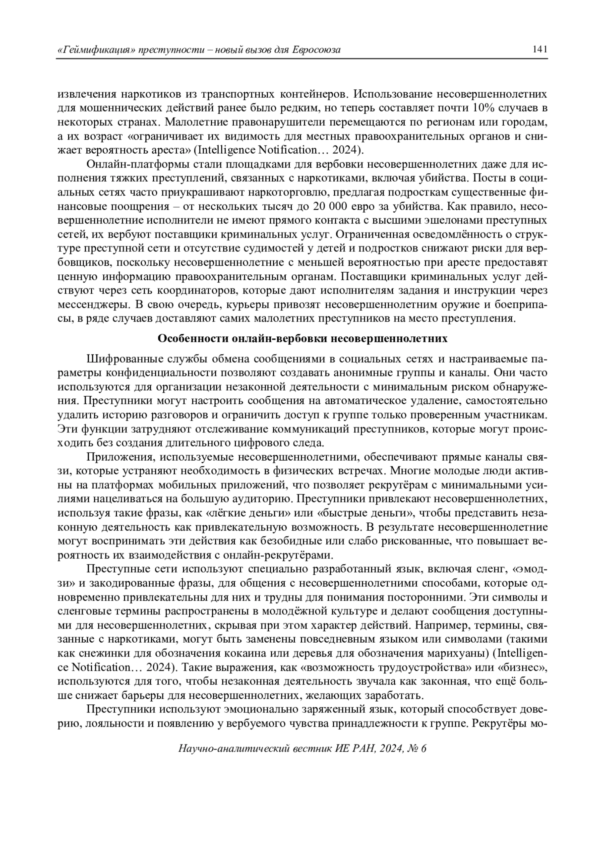 12 ноября 2024 г. полицейское агентство ЕС – Европол – опубликовало сообщение спецслужб о вербовке несовершеннолетних преступными сетями по всей Европе. В сообщении, основанном на информации, предоставленной Европолу правоохранительными органами государств – членов ЕС, говорится о том, как преступные организации выслеживают детей и подростков через социальные сети и игровые платформы, отправляя им зашифрованные сообщения, чтобы вербовать их для совершения серьёзных преступлений. По заявлению Европола, данные, предоставленные агентству, показывают, что несовершеннолетние в настоящее время вовлечены в более чем 70% преступных рынков. «Эти рынки включают киберпреступность и онлайн-мошенничество, торговлю наркотиками и связанное с этим насилие, незаконный ввоз мигрантов и имущественные преступления» (Intelligence Notification… 2024).