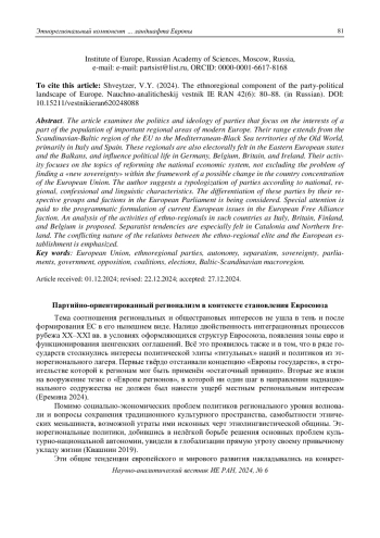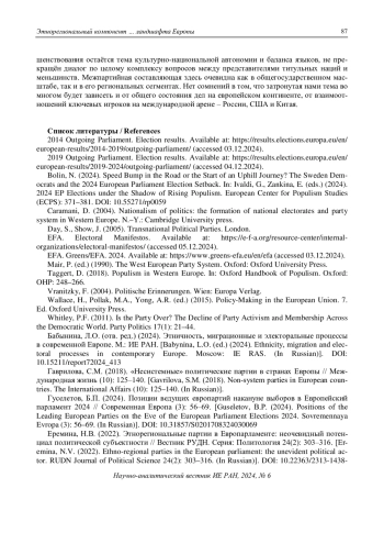 16. Еремина, Н.В. (2022). Этнорегиональные партии в Европарламенте: неочевидный потенциал политической субъектности // Вестник РУДН. Серия: Политология 24(2): 303-316. EDN: KYDMYM