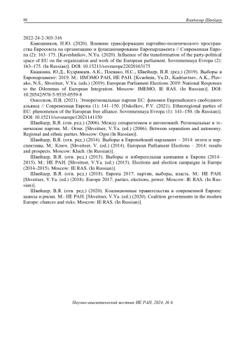 17. Кавешников, Н.Ю. (2020). Влияние трансформации партийно-политического пространства Евросоюза на организацию и функционирование Европарламента // Современная Европа (2): 163-175. EDN: UEIIQN