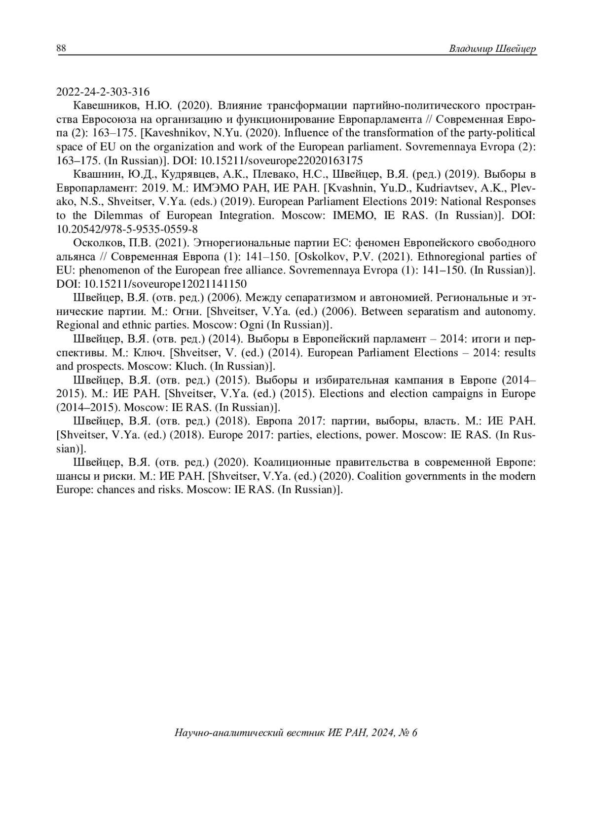 23. Швейцер, В.Я. (отв. ред.) (2018). Европа 2017: партии, выборы, власть. М.: ИЕ РАН.