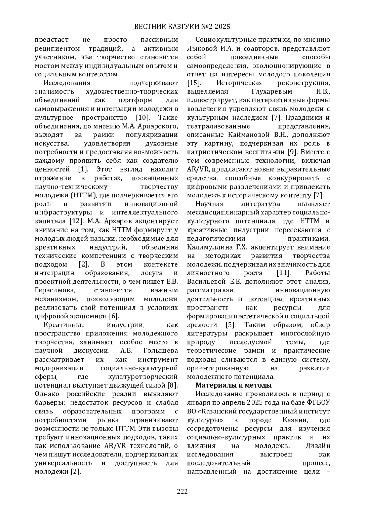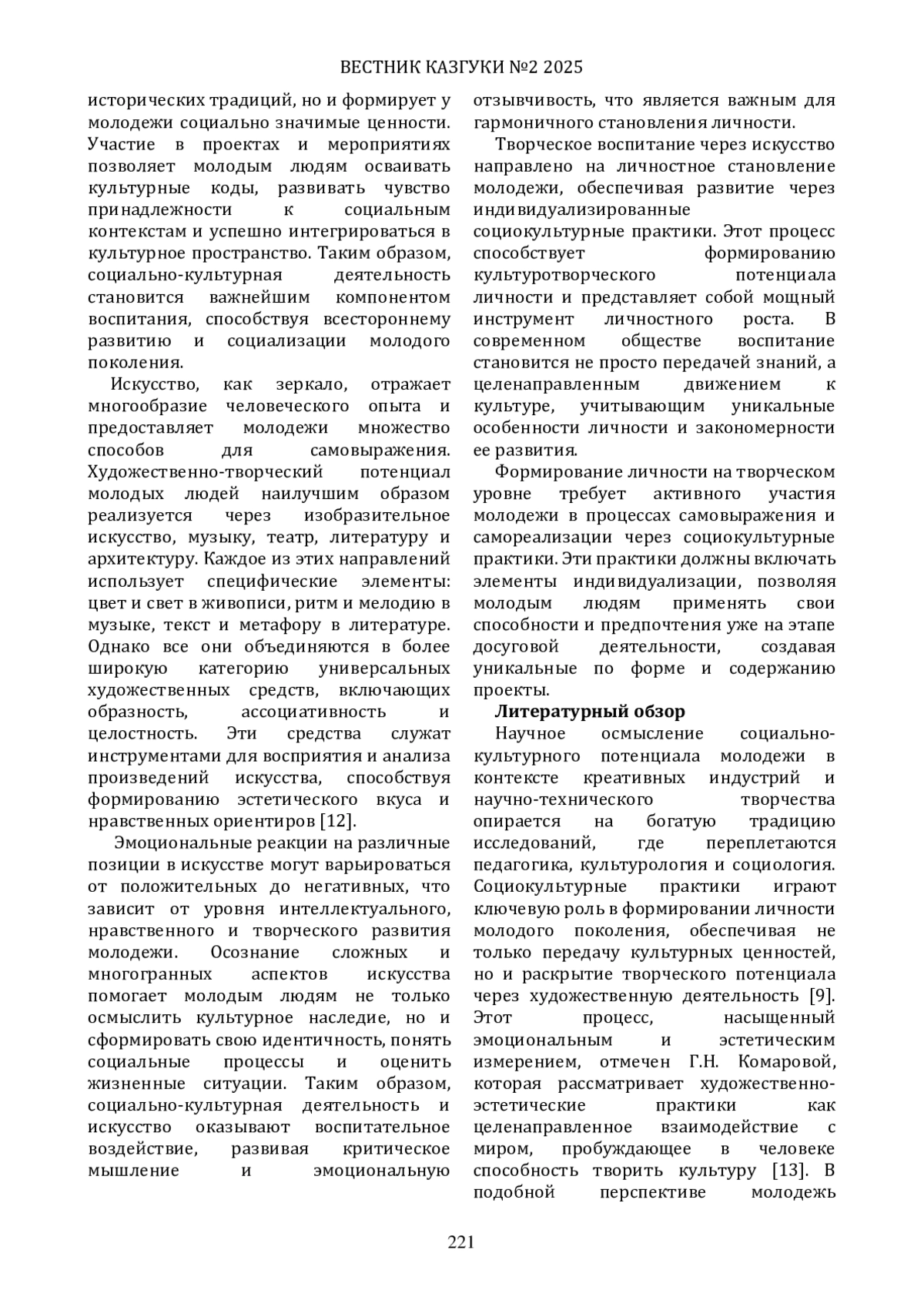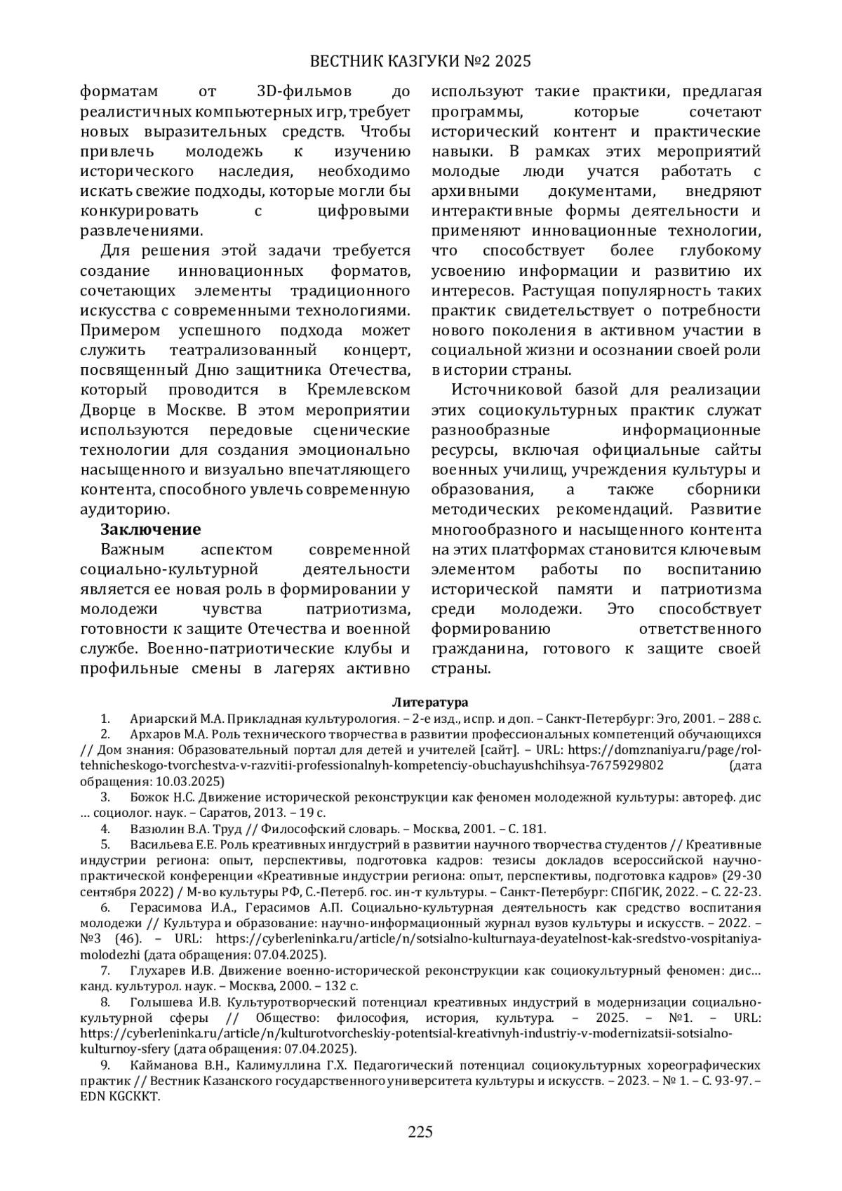 6. Герасимова И.А., Герасимов А.П. Социально-культурная деятельность как средство воспитания молодежи // Культура и образование: научно-информационный журнал вузов культуры и искусств. - 2022. - №3 (46). - URL: https://cyberleninka.ru/article/n/sotsialno-kulturnaya-deyatelnost-kak-sredstvo-vospitaniya-molodezhi (дата обращения: 07.04.2025). EDN: DBSJAL
