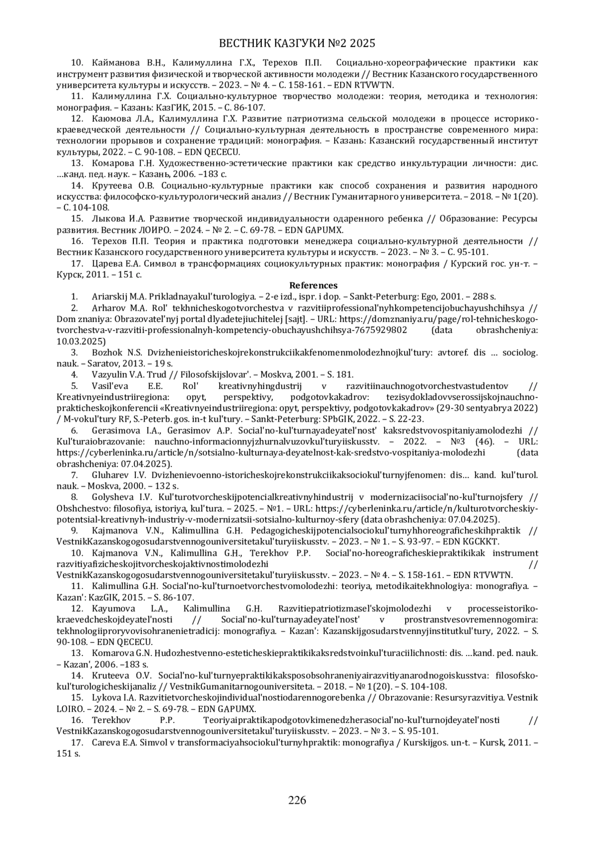 9. Кайманова В.Н., Калимуллина Г.Х. Педагогический потенциал социокультурных хореографических практик // Вестник Казанского государственного университета культуры и искусств. - 2023. - № 1. - С. 93-97. EDN: KGCKKT