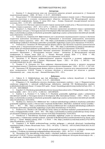 5. Плюхина А.А., Смирнова Н.В. Эффективность икт в реализации индивидуального подхода к обучению подростков грамматике английского языка // Образование и воспитание дошкольников, школьников, молодежи: теория и практика. - 2023. - №2. - URL: https://cyberleninka.ru/article/n/effektivnost-ikt-v-realizatsii-individualnogo-podhoda-k-obucheniyu-podrostkov-grammatike-angliyskogo-yazyka (дата обращения: 07.04.2025). EDN: OVUXCI