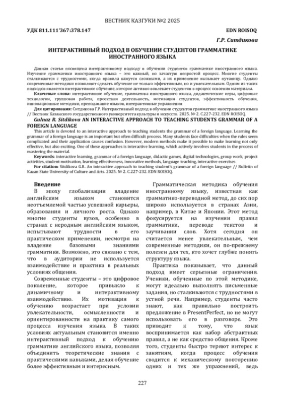 Данная статья посвящена интерактивному подходу в обучении студентов грамматике иностранного языка. Изучение грамматики иностранного языка - это важный, но зачастую непростой процесс. Многие студенты сталкиваются с трудностями, когда правила кажутся сложными, а их применение вызывает путаницу. Однако современные методики позволяют сделать обучение не только эффективным, но и увлекательным. Одним из таких подходов является интерактивное обучение, которое активно вовлекает студентов в процесс освоения материала.