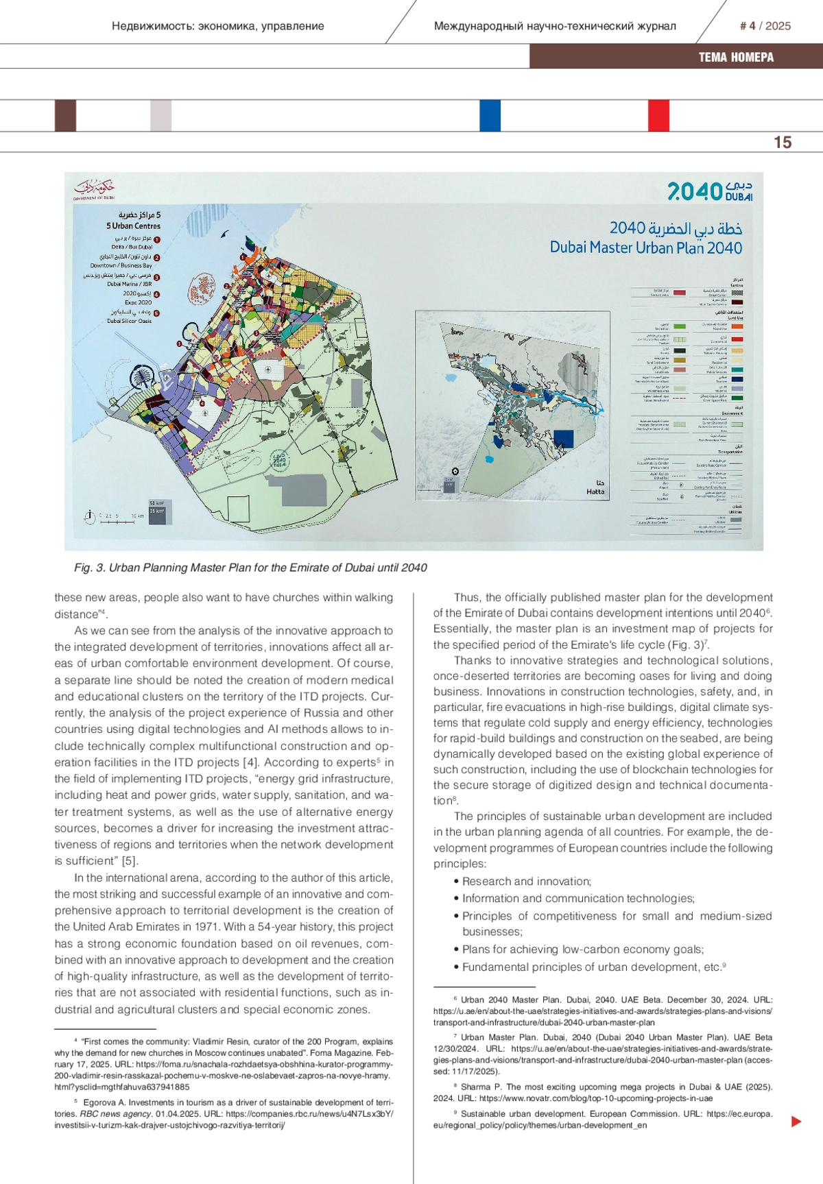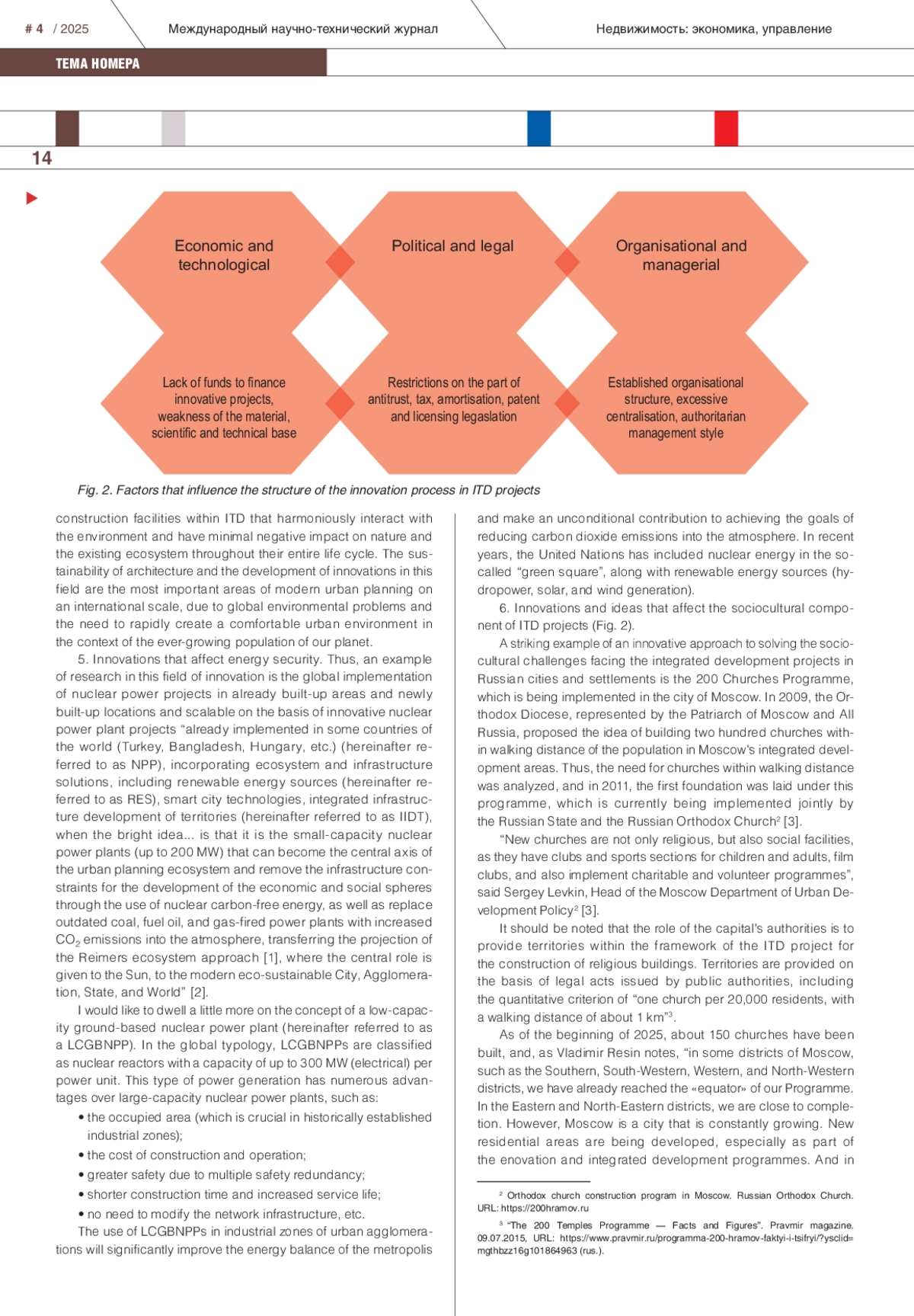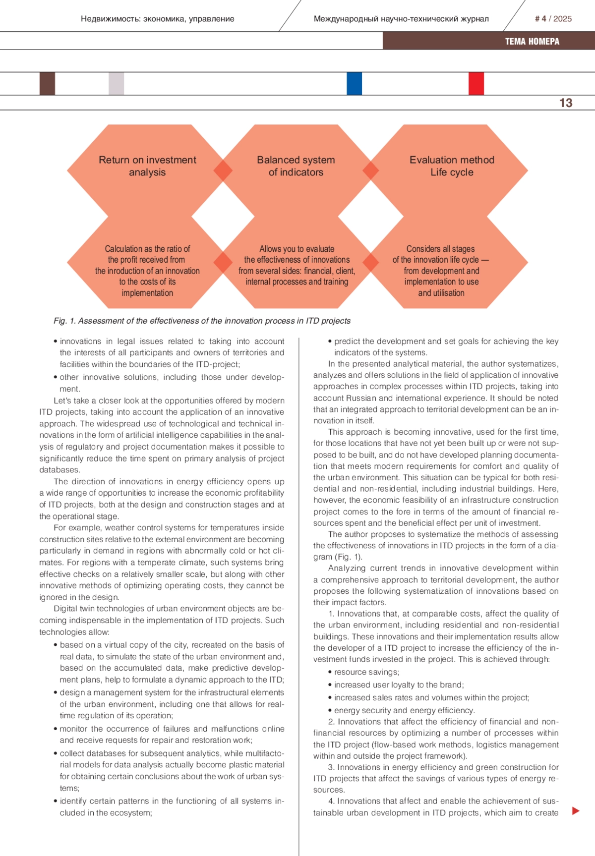 В статье рассмотрены вопросы российских и международных решений в области инноваций в проектах комплексного развития территорий. Приведен анализ направлений применения инновационных решений в градостроительной сфере, формировании комфортной городской среды. Технологические решения программных комплексов в области business intelligence, позволяющие выявлять проблемы и предлагать способы их решения, помогающие бизнесу реализовывать проекты комплексного развития территорий более эффективно, становятся интересны при реализации проектов по модели государственно-частного партнерства. Проведенный автором подробный анализ структуры проектов комплексного развития территорий помогает применять инновационный подход в каждой из частей проекта с максимальным экономическим эффектом. Встраивание в проекты территориального развития энергоэффективных решений, методик оценки организационно-технологической надежности на всех этапах жизненного цикла объектов строительства, систем погодного регулирования и «зеленых технологий» формирует положительный экономический эффект от инновационного подхода к проектированию и застройке существующих новых территорий. Инновации в правовом регулировании, по мнению автора, положительно влияют на итоговые сроки реализации крупномасштабных инфраструктурно-значимых проектов. Умные города и комфортная среда становятся центрами притяжения людей, что позволяет достичь первоначальных и главных целей реализации проектов комплексного развития территорий.