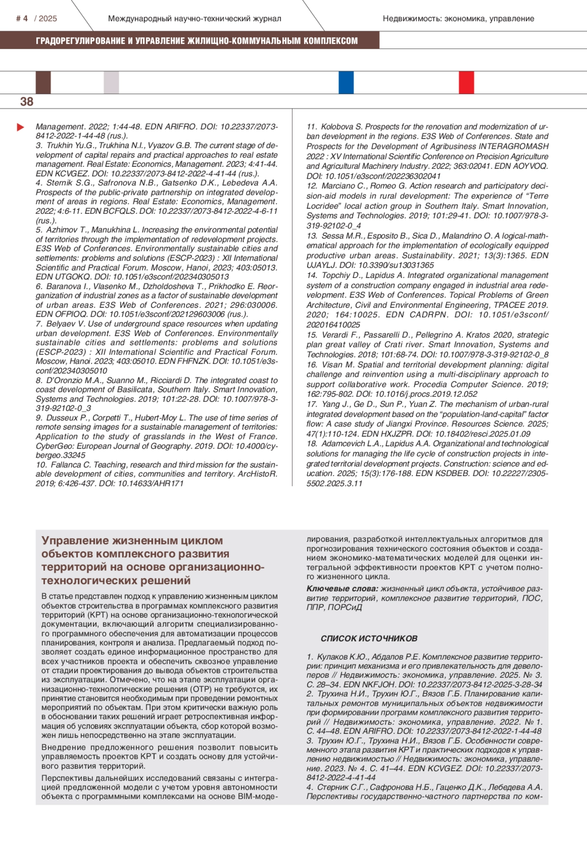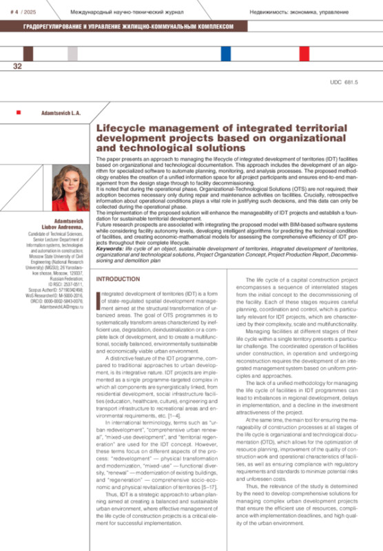 В статье представлен подход к управлению жизненным циклом объектов строительства в программах комплексного развития территорий (КРТ) на основе организационно-технологической документации, включающий алгоритм специализированного программного обеспечения для автоматизации процессов планирования, контроля и анализа. Предлагаемый подход позволяет создать единое информационное пространство для всех участников проекта и обеспечить сквозное управление от стадии проектирования до вывода объектов строительства из эксплуатации. Отмечено, что на этапе эксплуатации организационно-технологические решения (ОТР) не требуются, их принятие становится необходимым при проведении ремонтных мероприятий по объектам. При этом критически важную роль в обосновании таких решений играет ретроспективная информация об условиях эксплуатации объекта, сбор которой возможен лишь непосредственно на этапе эксплуатации. Внедрение предложенного решения позволит повысить управляемость проектов КРТ и создать основу для устойчивого развития территорий. Перспективы дальнейших исследований связаны с интеграцией предложенной модели с учетом уровня автономности объекта с программными комплексами на основе BIM-моделирования, разработкой интеллектуальных алгоритмов для прогнозирования технического состояния объектов и созданием экономико-математических моделей для оценки интегральной эффективности проектов КРТ с учетом полного жизненного цикла.