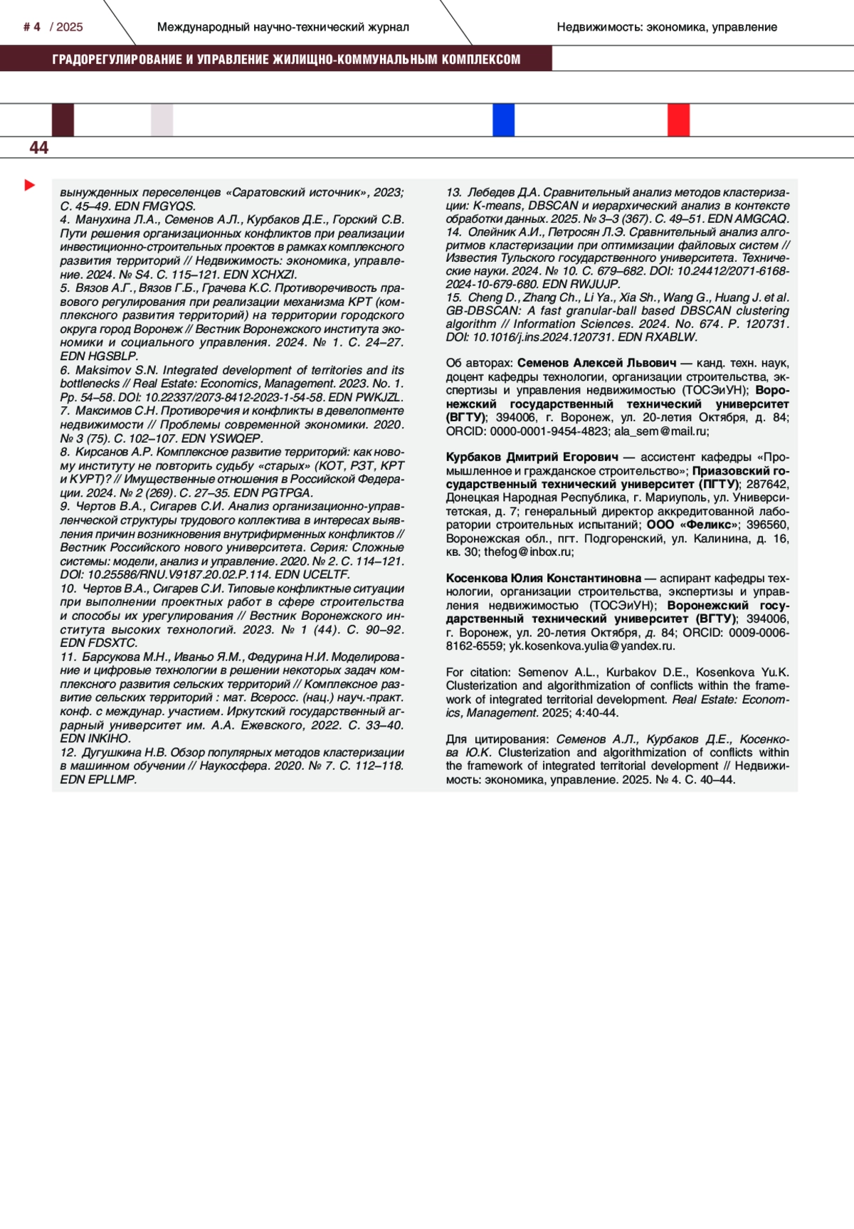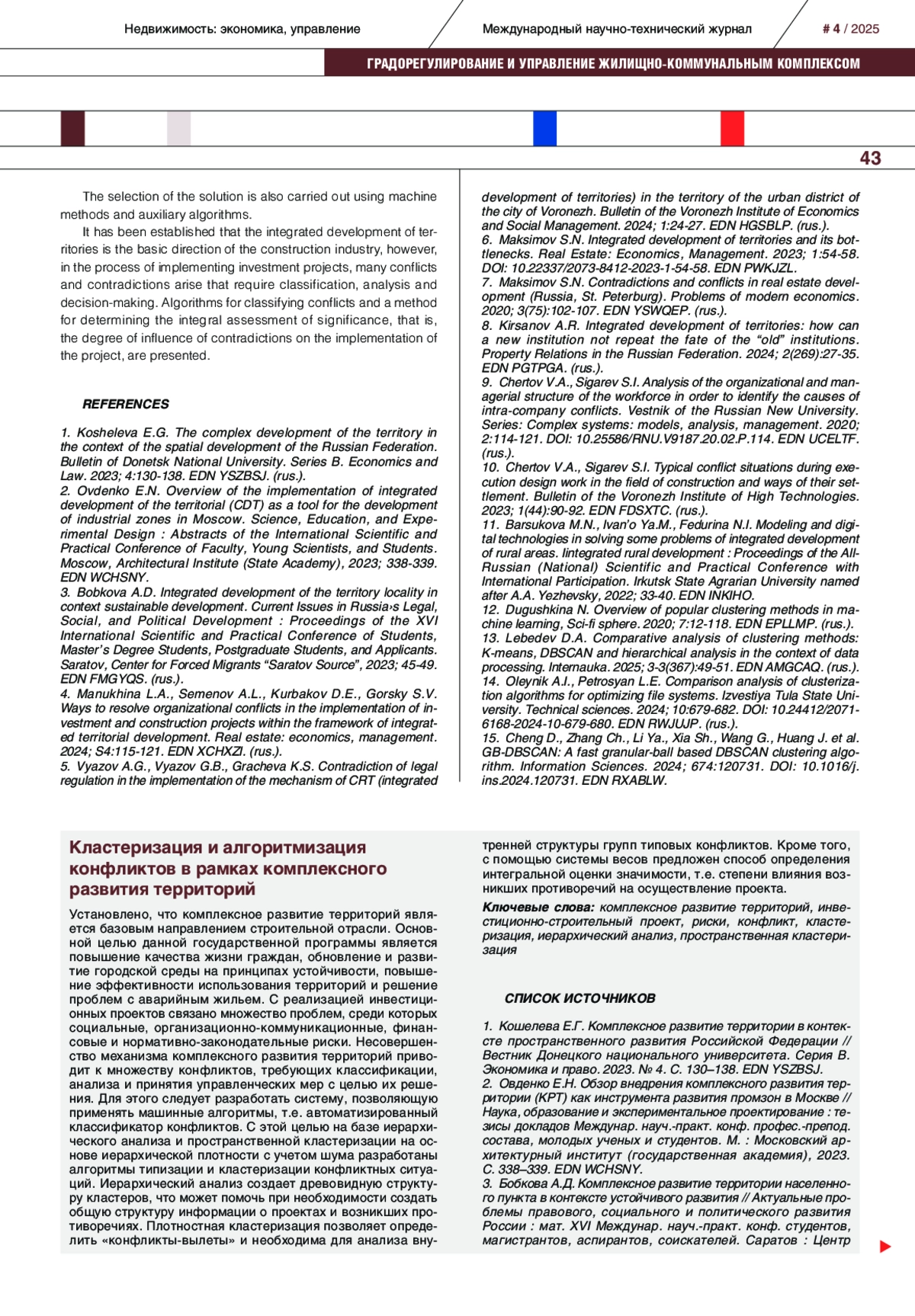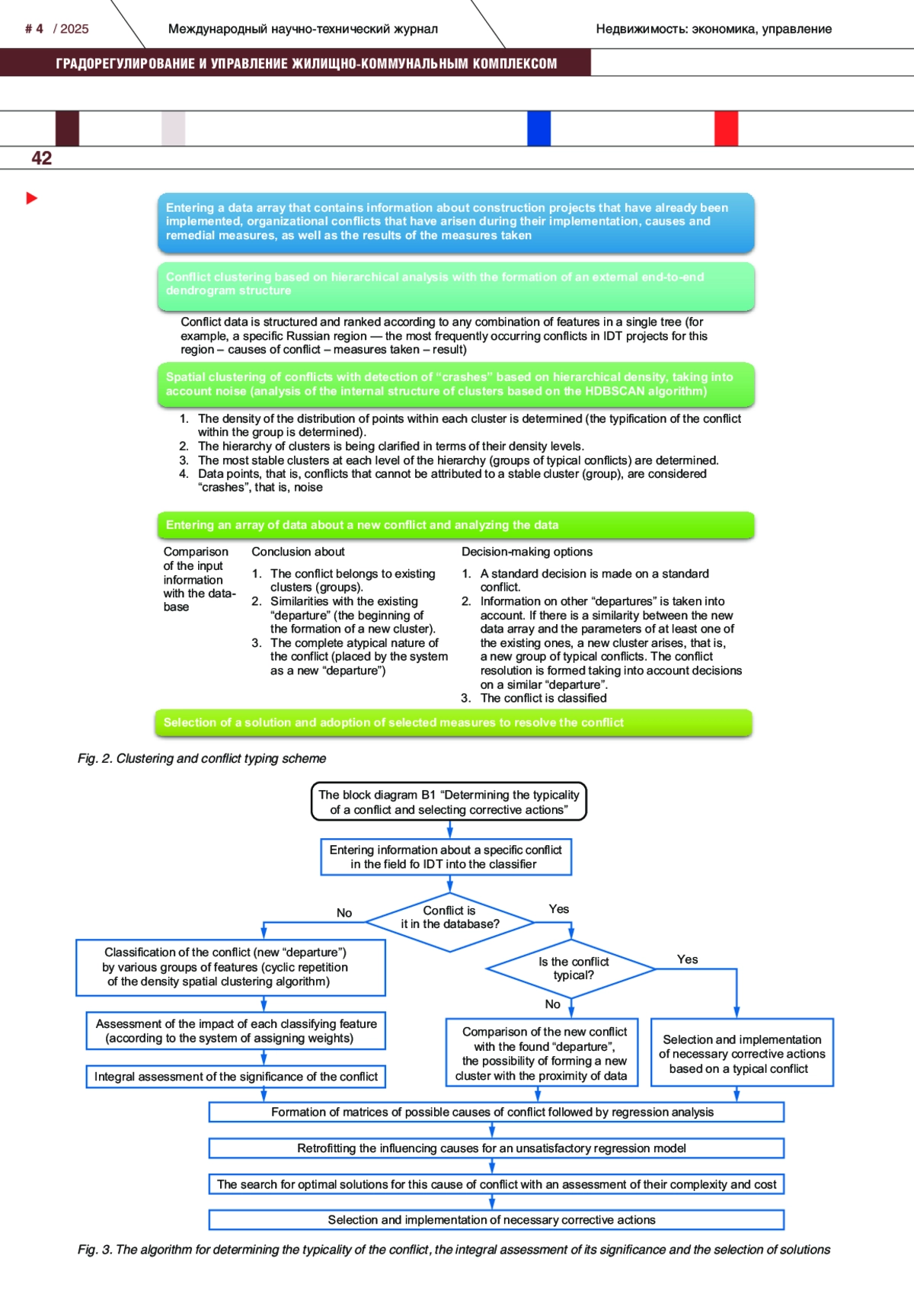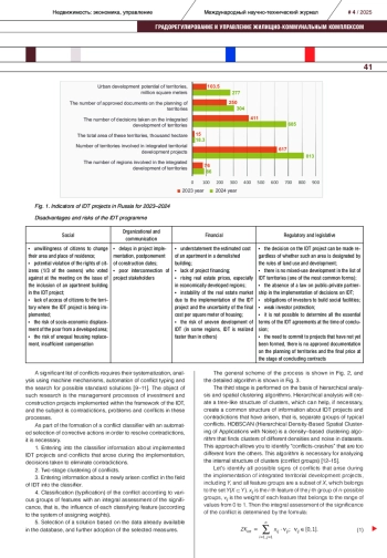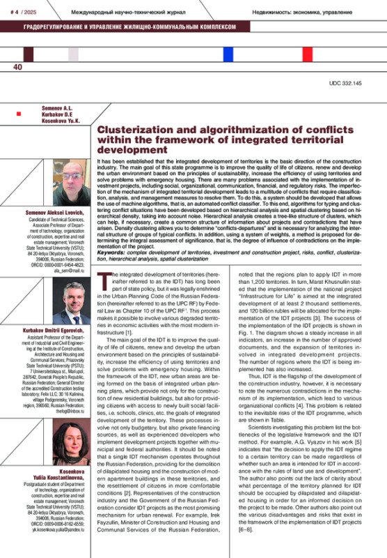 Установлено, что комплексное развитие территорий является базовым направлением строительной отрасли. Основной целью данной государственной программы является повышение качества жизни граждан, обновление и развитие городской среды на принципах устойчивости, повышение эффективности использования территорий и решение проблем с аварийным жильем. С реализацией инвестиционных проектов связано множество проблем, среди которых социальные, организационно-коммуникационные, финансовые и нормативно-законодательные риски. Несовершенство механизма комплексного развития территорий приводит к множеству конфликтов, требующих классификации, анализа и принятия управленческих мер с целью их решения. Для этого следует разработать систему, позволяющую применять машинные алгоритмы, т. е. автоматизированный классификатор конфликтов. С этой целью на базе иерархического анализа и пространственной кластеризации на основе иерархической плотности с учетом шума разработаны алгоритмы типизации и кластеризации конфликтных ситуаций. Иерархический анализ создает древовидную структуру кластеров, что может помочь при необходимости создать общую структуру информации о проектах и возникших противоречиях. Плотностная кластеризация позволяет определить «конфликты-вылеты» и необходима для анализа внутренней структуры групп типовых конфликтов. Кроме того, с помощью системы весов предложен способ определения интегральной оценки значимости, т. е. степени влияния возникших противоречий на осуществление проекта.