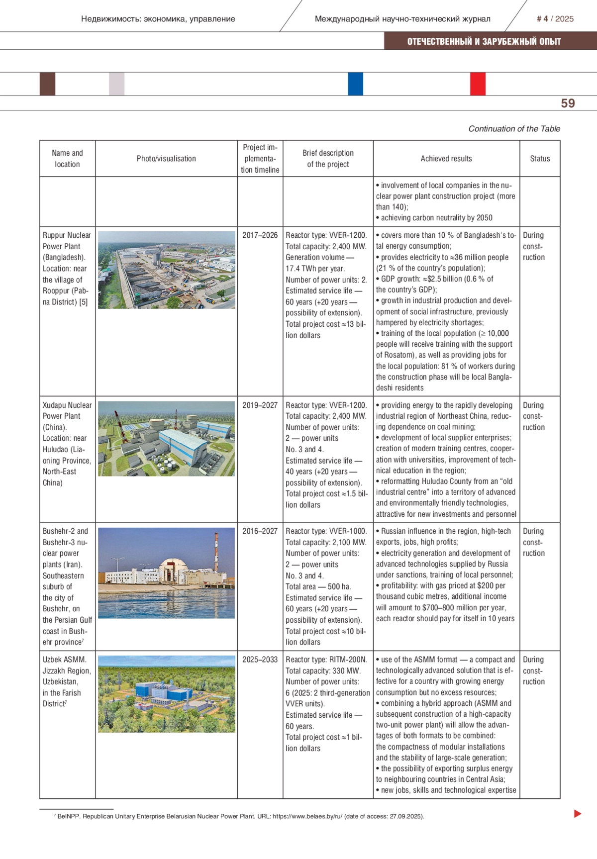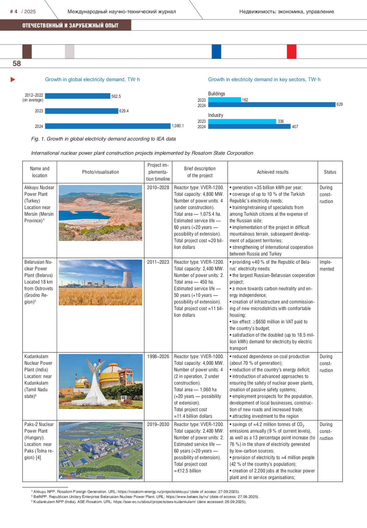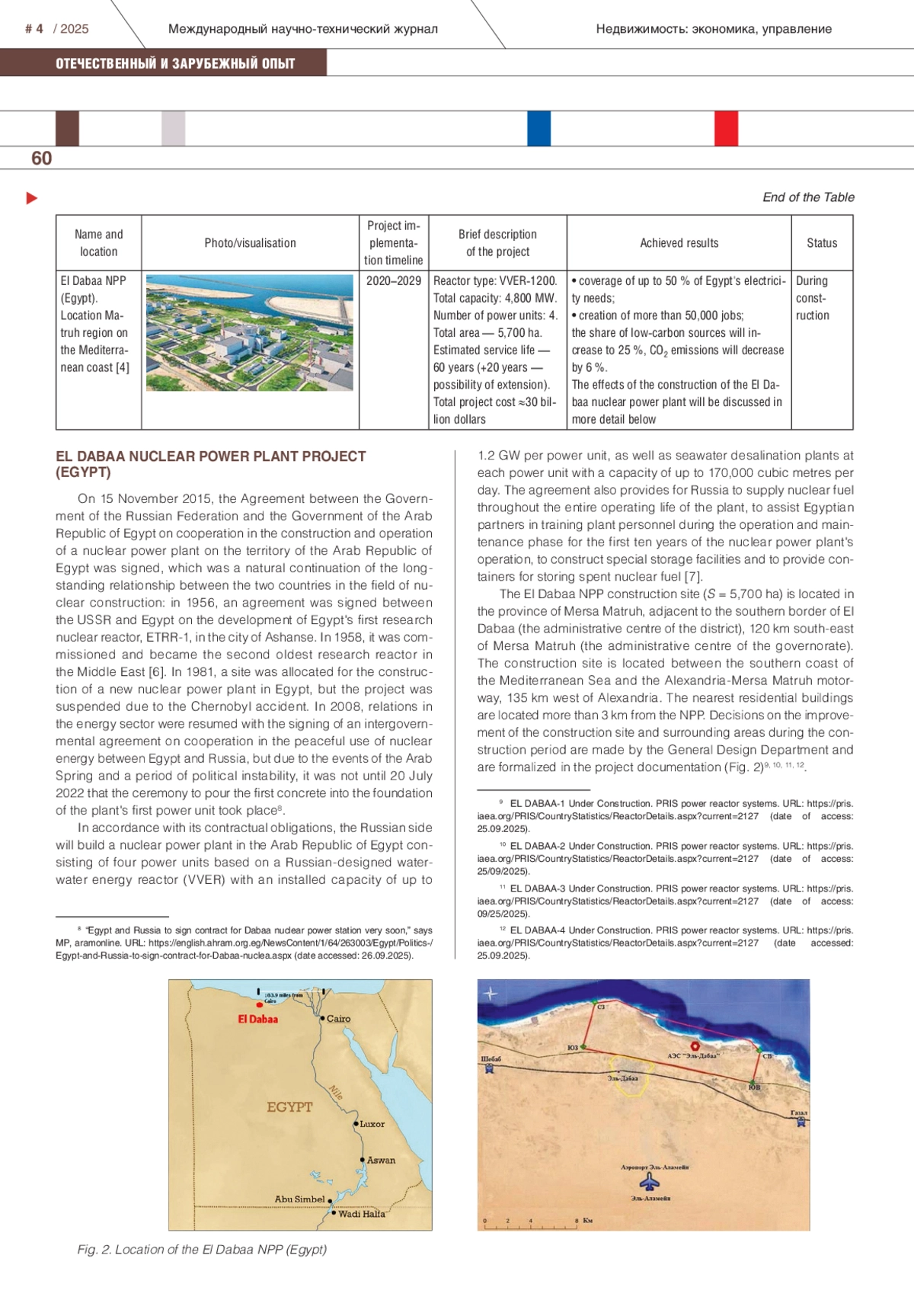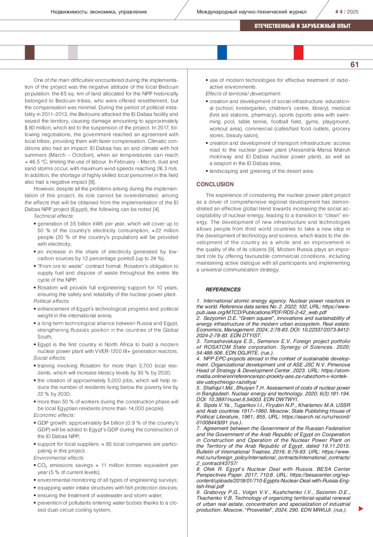 The IAEA predicts that in the middle of the 21st century, the total capacity of nuclear energy could grow by more than two and a half times and reach almost a thousand GW. Moreover, in the large part of the growth in demand for peaceful atom will be ensured by the countries of the Global South and East, which are strengthening their technological and industrial potential. Another significant factor of the growing interest in nuclear energy is the relevance for green standards and technologies which minimize the impact to the environment and climate, at the same time the nuclear power plants are an important source of clean, low-carbon energy. It favourably differ of other energy sources by the price ratio, environmental component, and the ability to provide stable energy capacity. The State Atomic Energy Corporation Rosatom (Rosatom) plays a key role in the production of atomic energy in Russia. Today, Rosatom continues to build 39 power units in 11 countries around the world: Hungary, Latin America, Bolivia, Bangladesh and others. The authors of the article presented an analysis of international projects, highlighting the most significant effects obtained from the creation of nuclear power plants. The authors of the article presented an analysis of international projects, and highlighted the most significant effects obtained from the creation of nuclear power plants. Special attention was paid to the implementation of the megaproject of the international intergovernmental atomic energy complex “El-Dabaa” in Egypt. The article highlights the relationship between the Russian Federation and the Arab Republic of Egypt at the field of nuclear energy, their agreement of cooperation in the construction and operation of a nuclear power plant in Egypt, examines the difficulties encountered in the implementation of the project, and also describes and systematizes the results and effects of the project (technical, political, social, economic, and development effects of the territory).