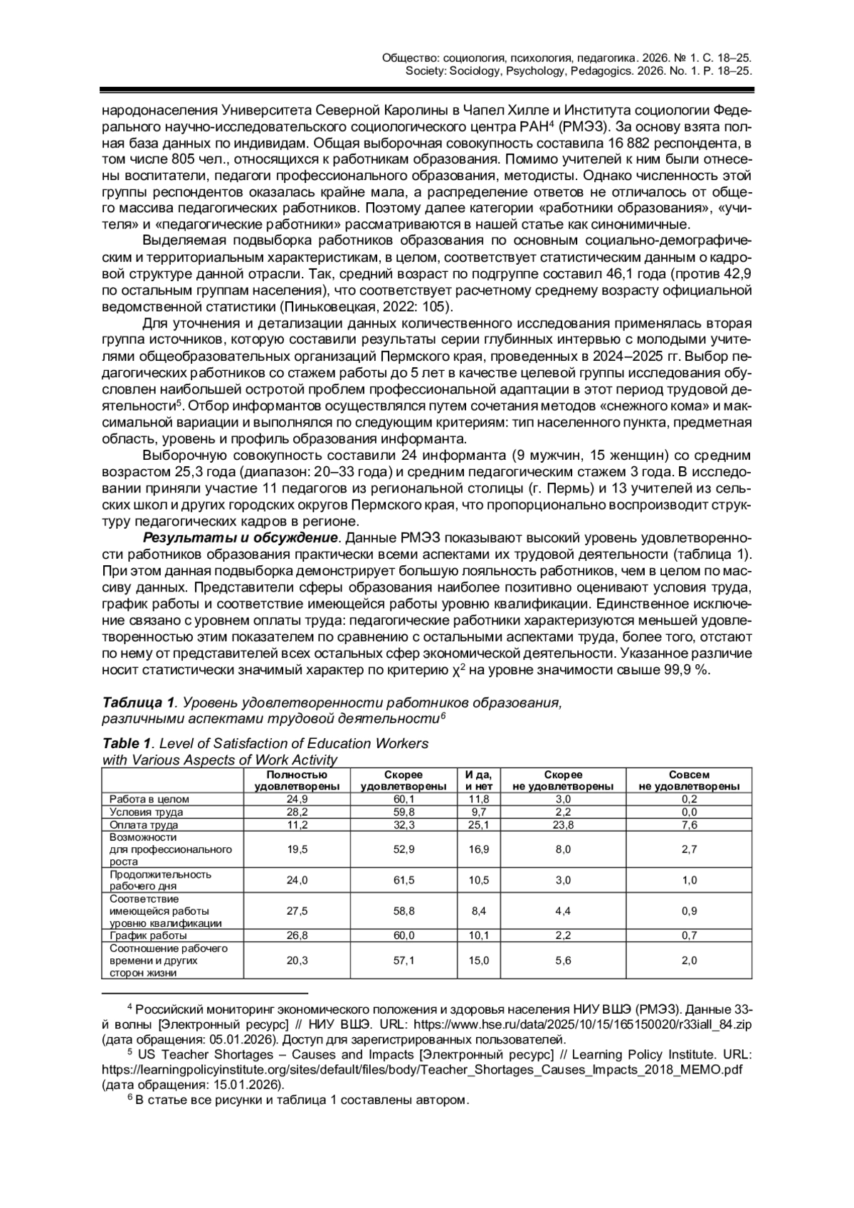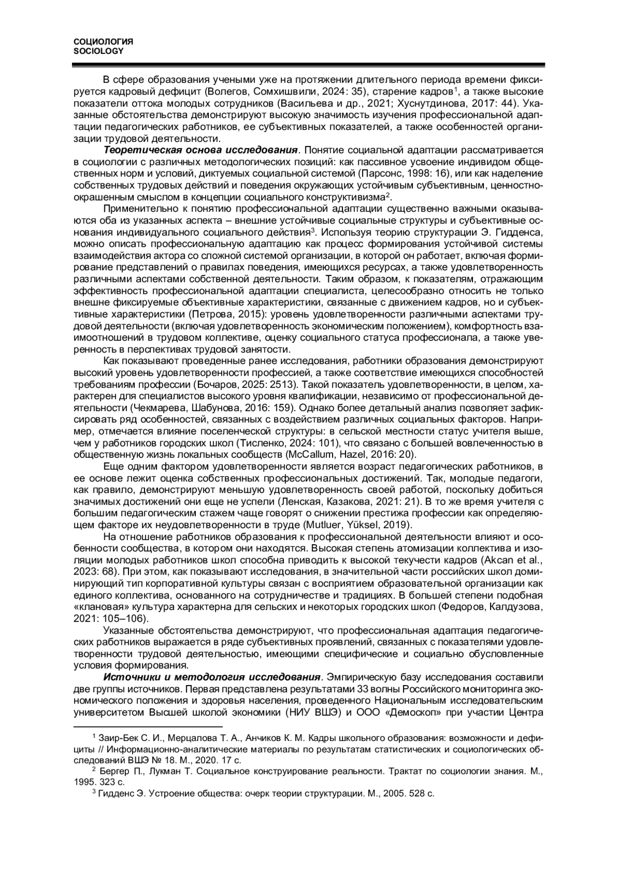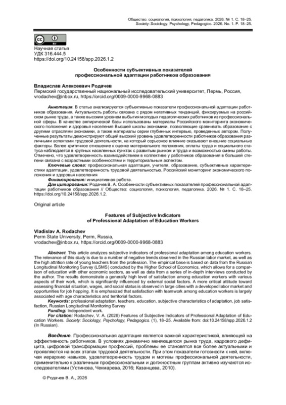 В статье анализируются субъективные показатели профессиональной адаптации работников образования. Актуальность работы связана с рядом негативных тенденций, фиксируемых на российском рынке труда, а также высоким уровнем выбытия молодых педагогических работников из профессиональной сферы. В качестве эмпирической базы использованы материалы Российского мониторинга экономического положения и здоровья населения Высшей школы экономики, позволяющие сравнивать образование с другими отраслями экономики, а также материалы серии глубинных интервью, проведенных автором. Полученные результаты демонстрируют общий высокий уровень удовлетворенности работников образования различными аспектами трудовой деятельности, на который серьезное влияние оказывают внешние социальные факторы. Более критичное отношение к оценке материального положения, оплаты труда и социального статуса наблюдается в крупных населенных пунктах с развитым рынком и труда и возможностью смены работы. Отмечено, что удовлетворенность взаимодействием в коллективе у работников образования в большей степени связана с возрастными особенностями и территориальным аспектом.
