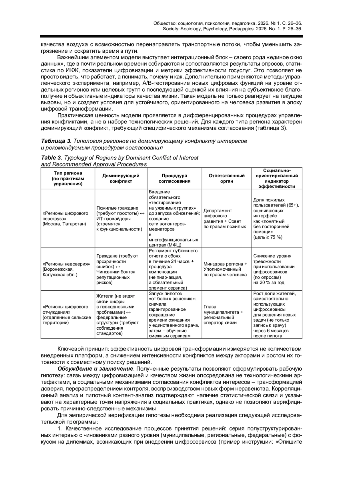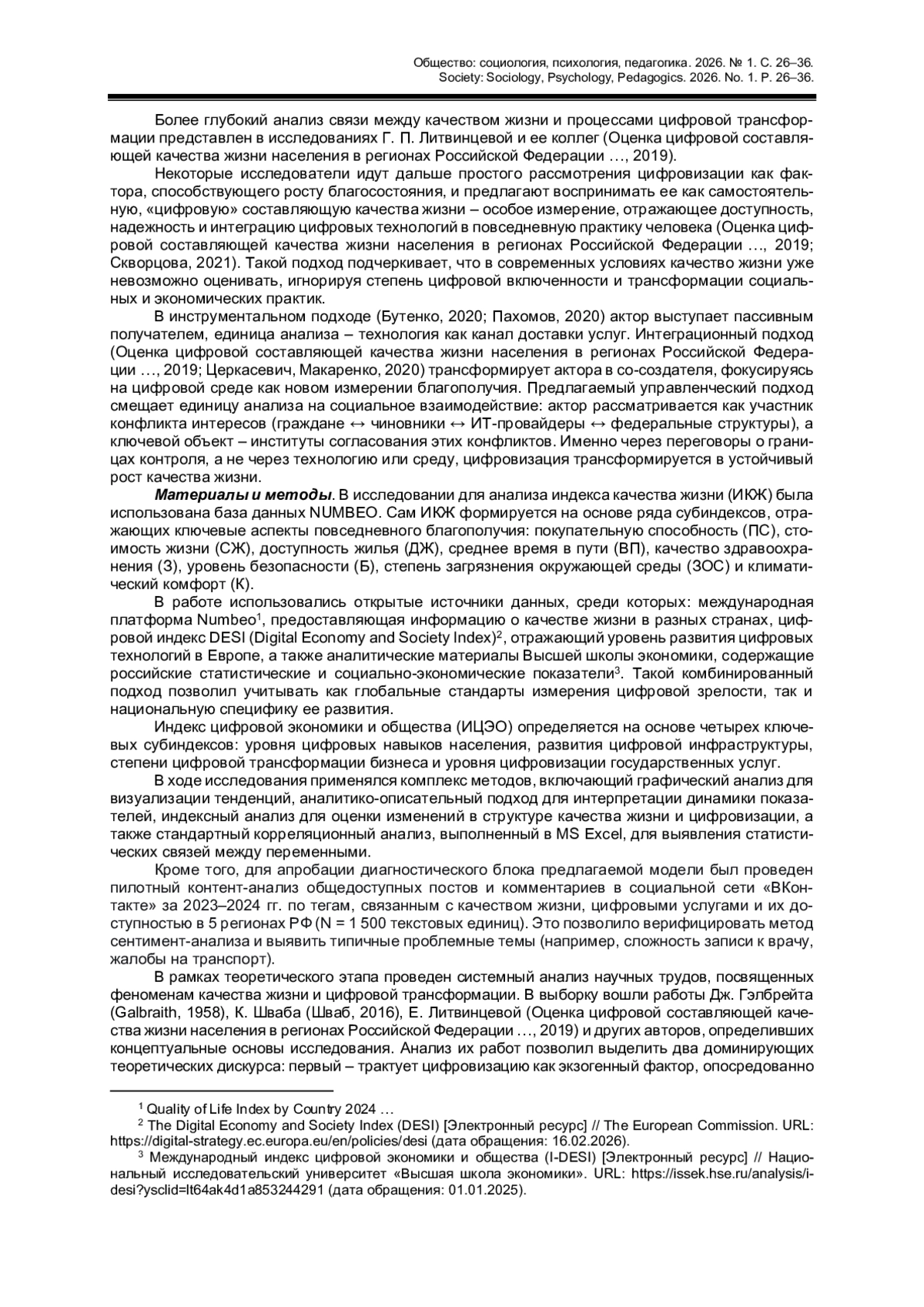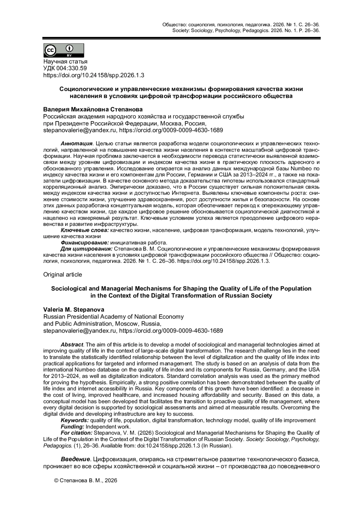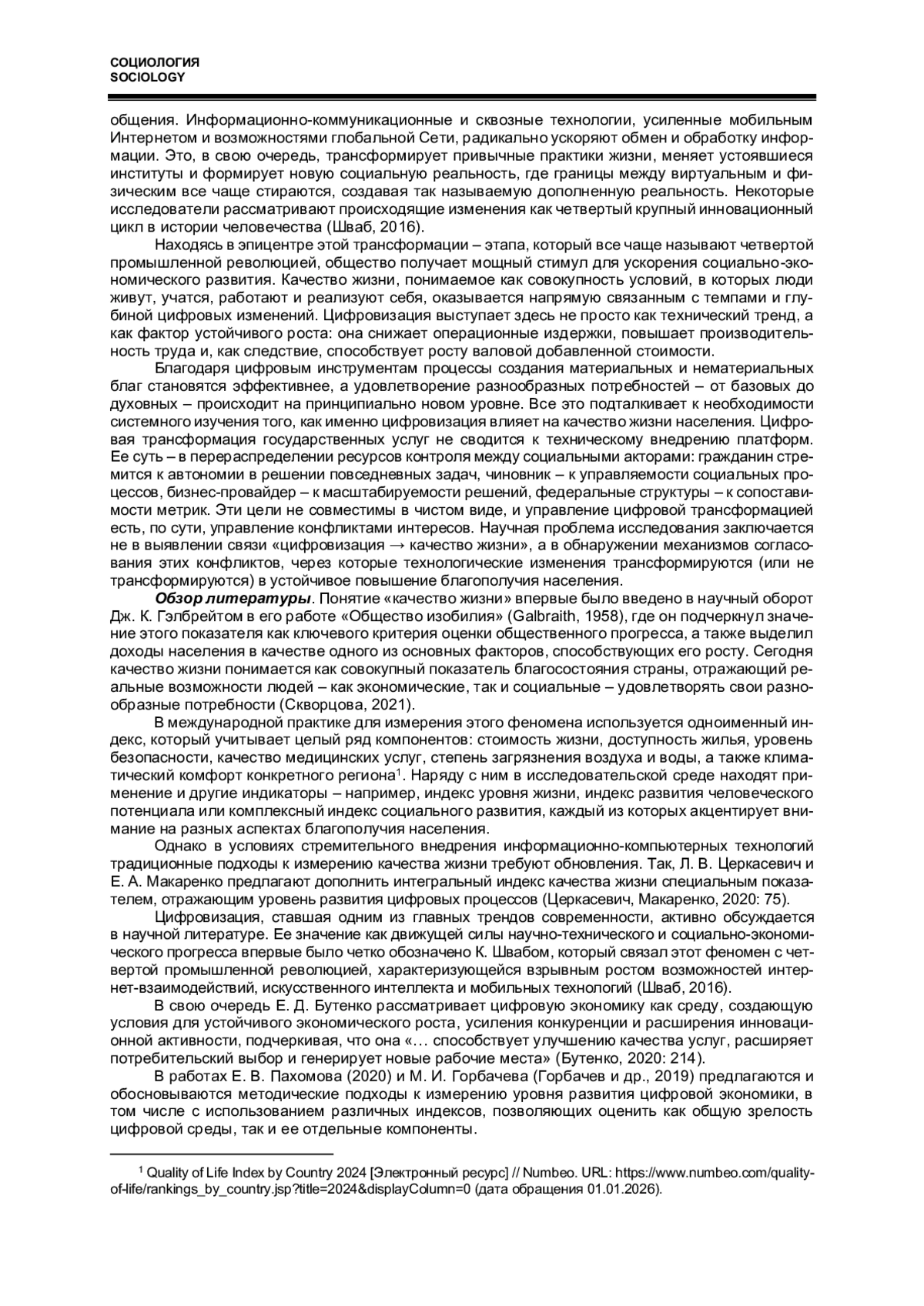 Целью статьи является разработка модели социологических и управленческих технологий, направленной на повышение качества жизни населения в контексте масштабной цифровой трансформации. Научная проблема заключается в необходимости перевода статистически выявленной взаимосвязи между уровнем цифровизации и индексом качества жизни в практическую плоскость адресного и обоснованного управления. Исследование опирается на анализ данных международной базы Numbeo по индексу качества жизни и его компонентам для России, Германии и США за 2013-2024 гг., а также на показатели цифровизации. В качестве основного метода доказательства гипотезы использовался стандартный корреляционный анализ. Эмпирически доказано, что в России существует сильная положительная связь между индексом качества жизни и доступностью Интернета. Выявлены ключевые компоненты роста: снижение стоимости жизни, улучшение здравоохранения, рост доступности жилья и безопасности. На основе этих данных разработана концептуальная модель, которая обеспечивает переход к опережающему управлению качеством жизни, где каждое цифровое решение обосновывается социологической диагностикой и нацелено на измеряемый результат. Ключевым условием успеха является преодоление цифрового неравенства и развитие инфраструктуры.
