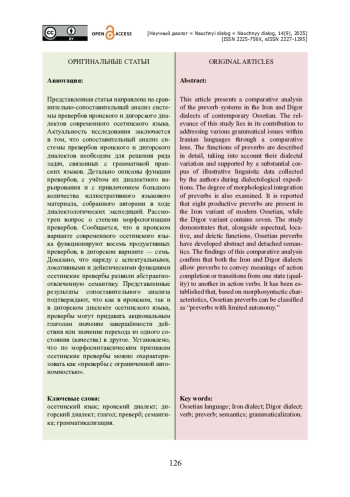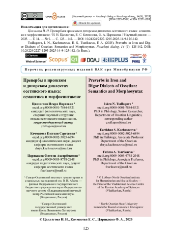 Представленная статья направлена на сравнительно-сопоставительный анализ системы превербов иронского и дигорского диалектов современного осетинского языка. Актуальность исследования заключается в том, что сопоставительный анализ системы превербов иронского и дигорского диалектов необходим для решения ряда задач, связанных с грамматикой иранских языков. Детально описаны функции превербов, с учётом их диалектного варьирования и с привлечением большого количества иллюстративного языкового материала, собранного авторами в ходе диалектологических экспедиций. Рассмотрен вопрос о степени морфологизации превербов. Сообщается, что в иронском варианте современного осетинского языка функционируют восемь продуктивных превербов, в дигорском варианте — семь. Доказано, что наряду с аспектуальными, локативными и дейктическими функциями осетинские превербы развили абстрактно-отвлеченную семантику. Представленные результаты сопоставительного анализа подтверждают, что как в иронском, так и в дигорском диалекте осетинского языка, превербы могут придавать акциональным глаголам значение завершённости действия или значение перехода из одного состояния (качества) в другое. Установлено, что по морфосинтаксическим признакам осетинские превербы можно охарактеризовать как «превербы с ограниченной автономностью».