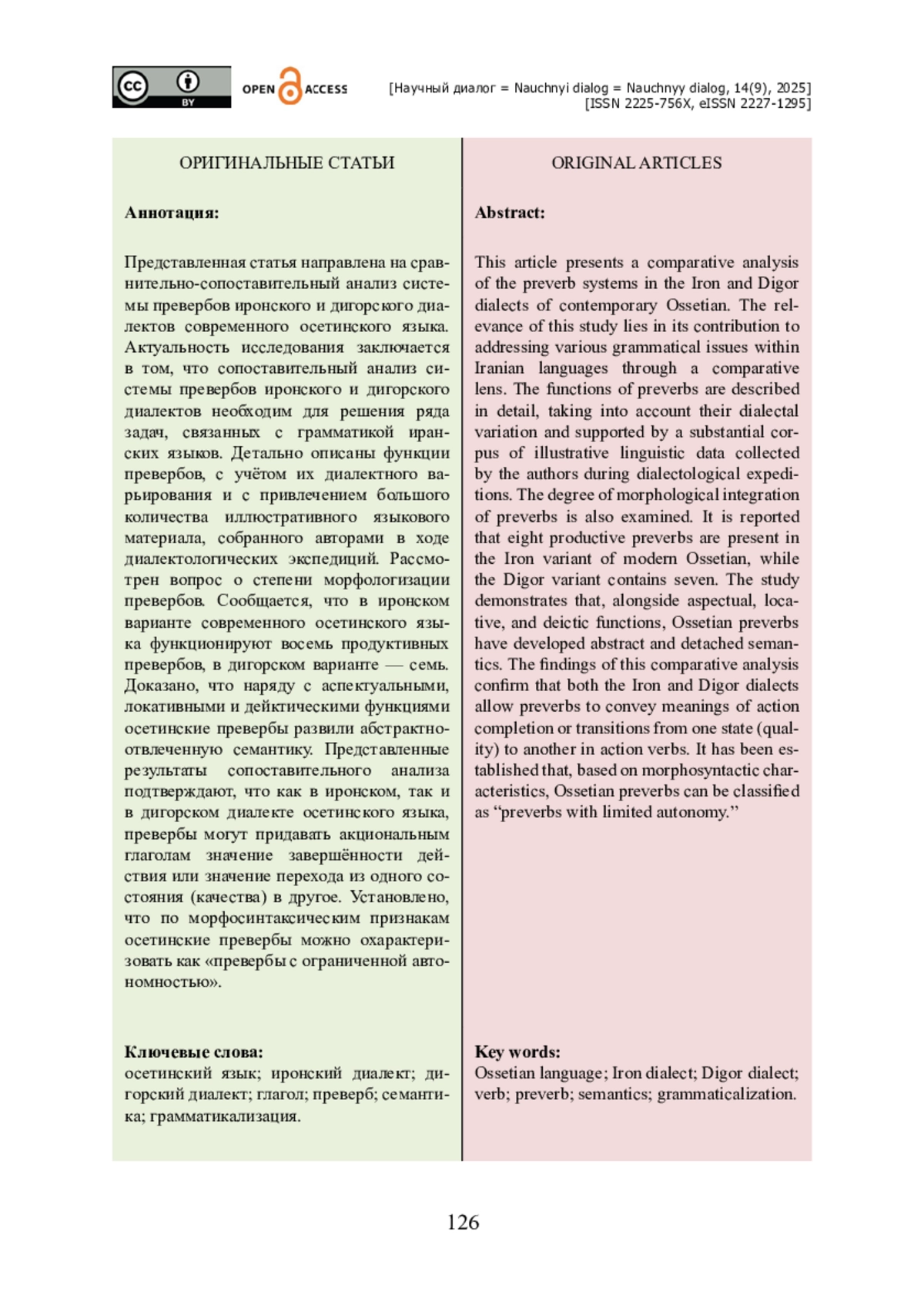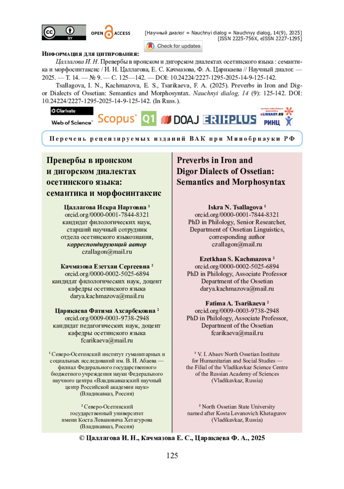 14. Кудзоева А. Ф. Простые глаголы в осетинском и персидском языках в сравнительно-сопоставительном аспекте / А. Ф. Кудзоева, Чангизи Эхсан, Абдоллахи Муса // Филологические науки. Вопросы теории и практики. - 2022. - Т. 15. - Выпуск 11. - С. 3655-3663. - https://doi.org/10.30853/phil20220609.