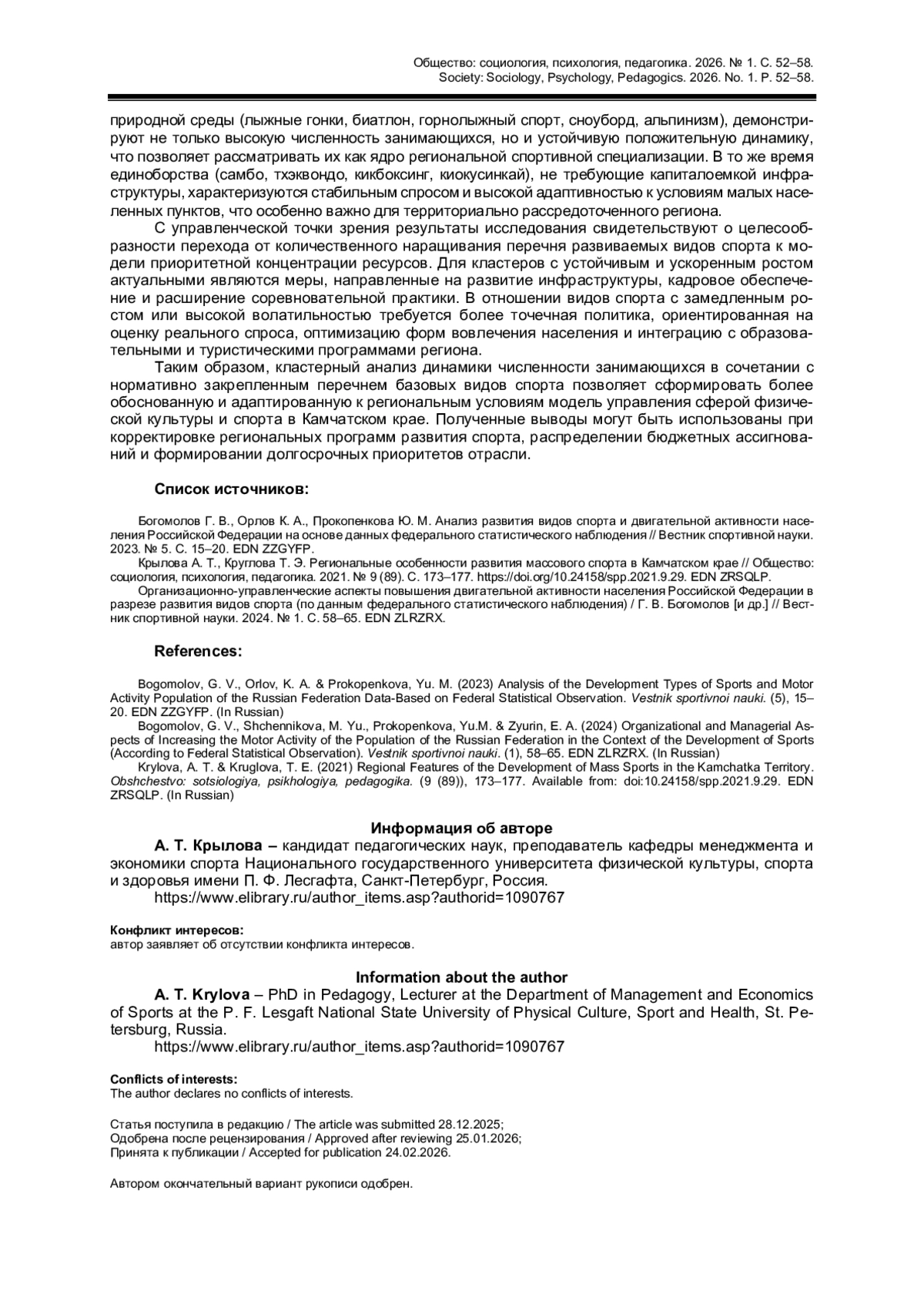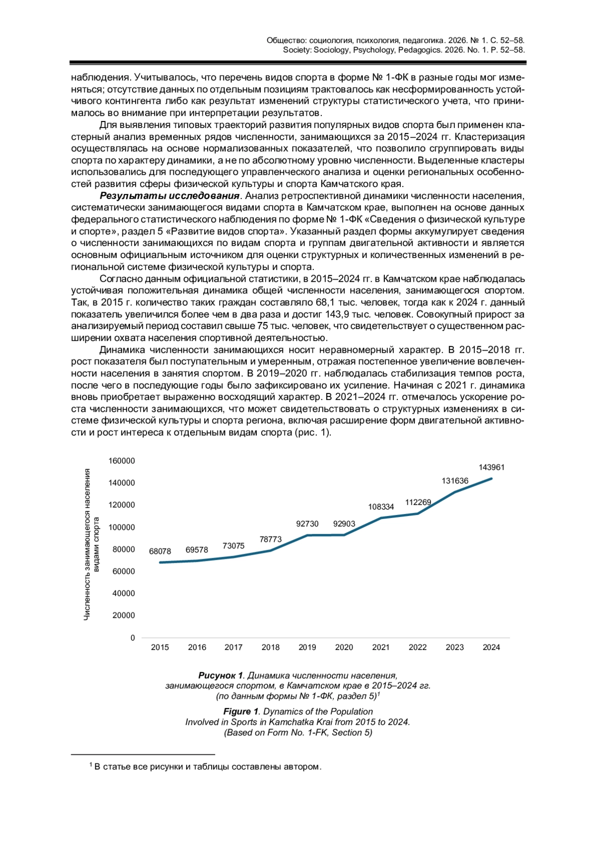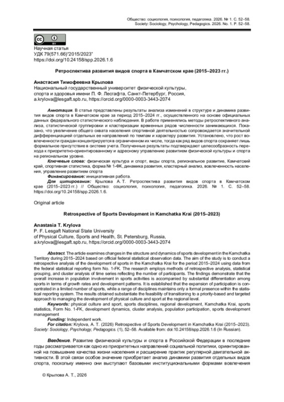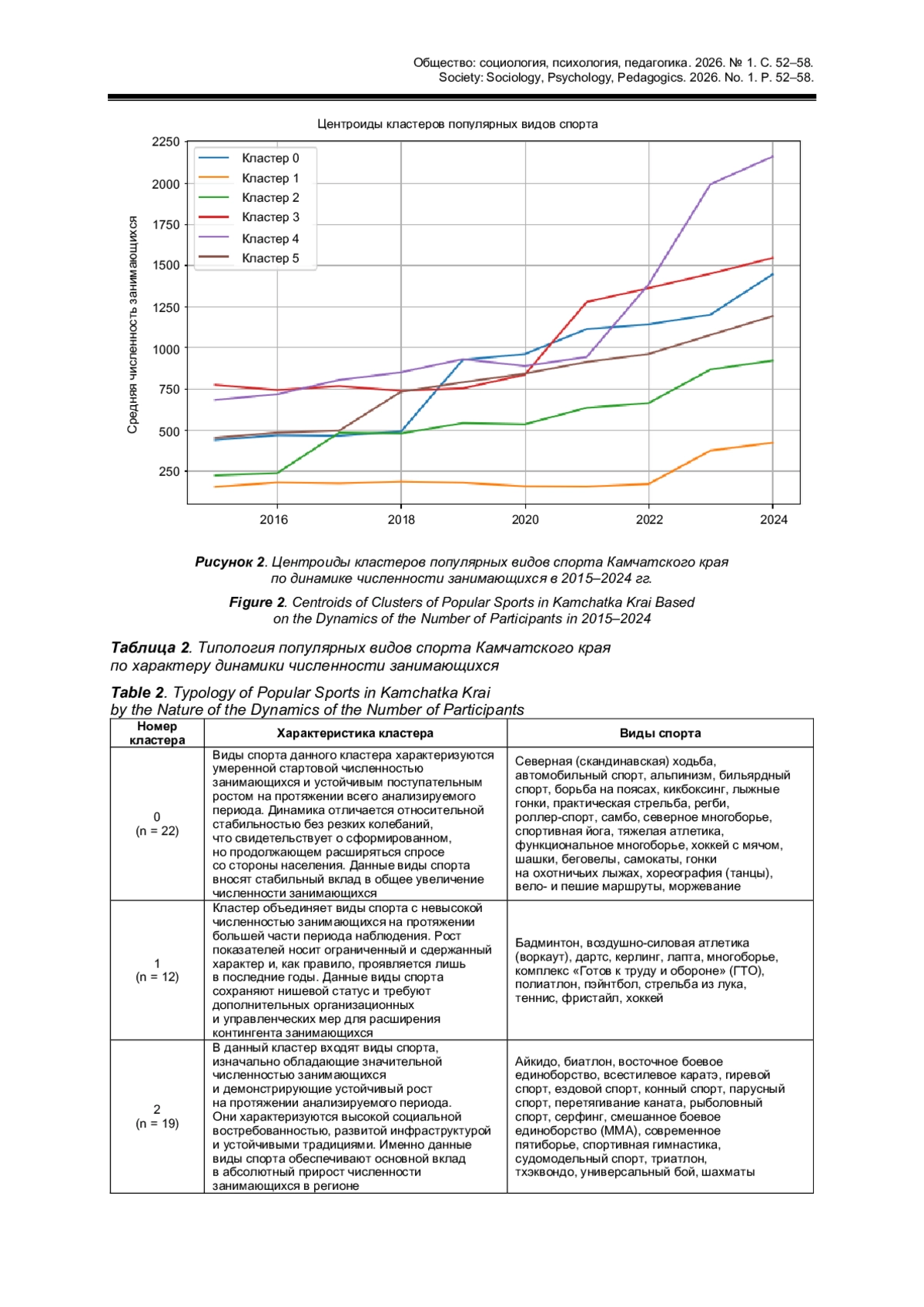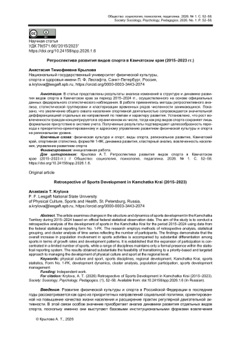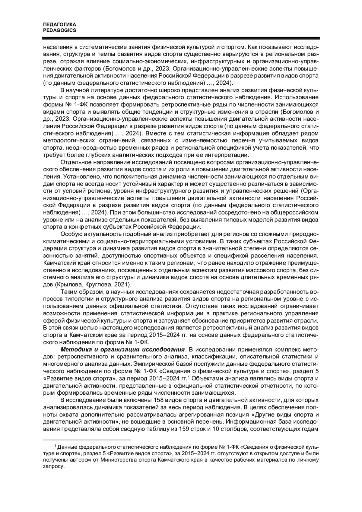 В статье представлены результаты анализа изменений в структуре и динамике развития видов спорта в Камчатском крае за период 2015-2024 гг., осуществленного на основе официальных данных федерального статистического наблюдения. В работе применялись методы ретроспективного анализа, статистической группировки и кластеризации временных рядов численности занимающихся. Показано, что увеличение общего охвата населения спортивной деятельностью сопровождается значительной дифференциацией отдельных ее направлений по темпам и характеру развития. Установлено, что рост вовлеченности граждан концентрируется в ограниченном их числе, тогда как ряд видов спорта сохраняет лишь формальное присутствие в системе учета.